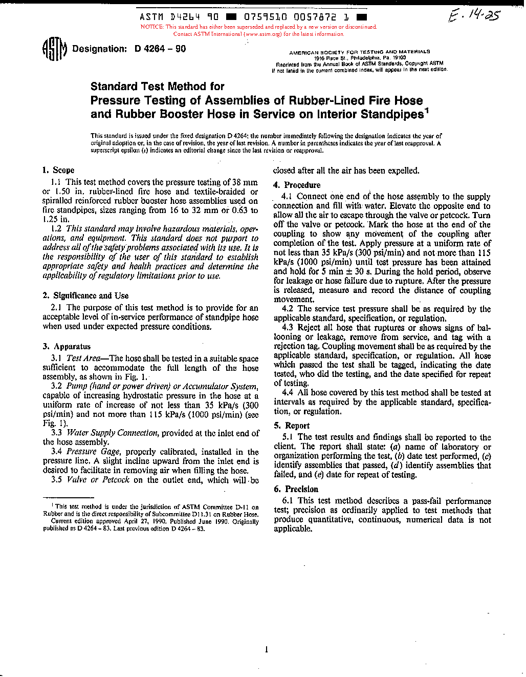 Test Method for Pressure Testing of Assemblies of Rubber-Lines Fire Hose and Rubber Booster Hose in Service on Interior Standpipes (Withdrawn 1997)