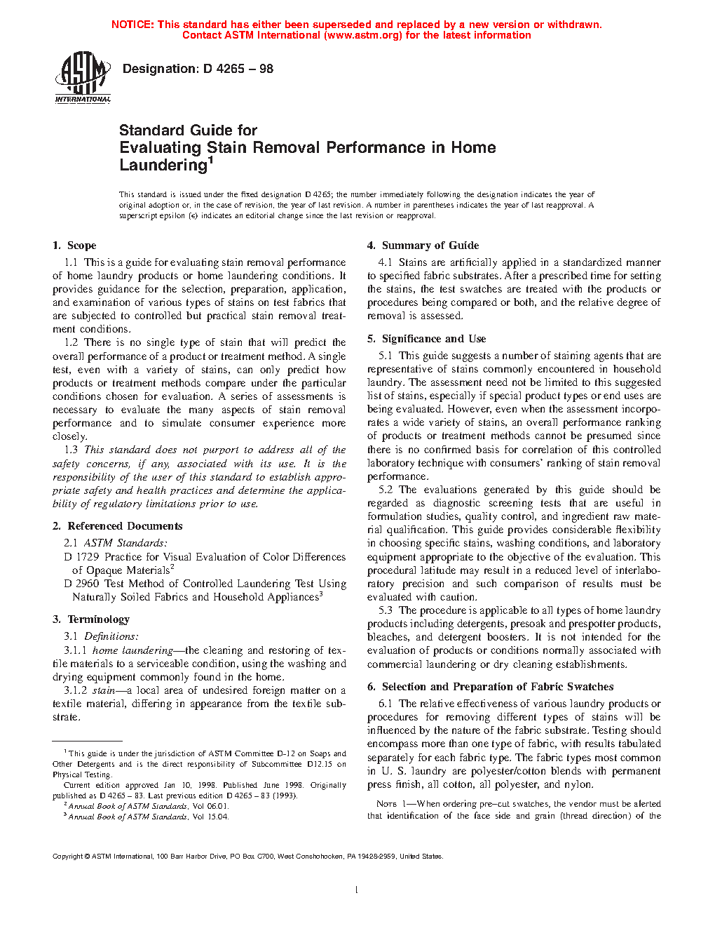 1.2 There is no single combination of stain and fabric that will predict the overall performance of a product or treatment method. A single test, even with a variety of stains/fabrics, can only predict how products or treatment methods compare under the particular conditions chosen for evaluations. A series of assessments is necessary to evaluate the many aspects of stain removal performance and to simulate consumer experience more closely.