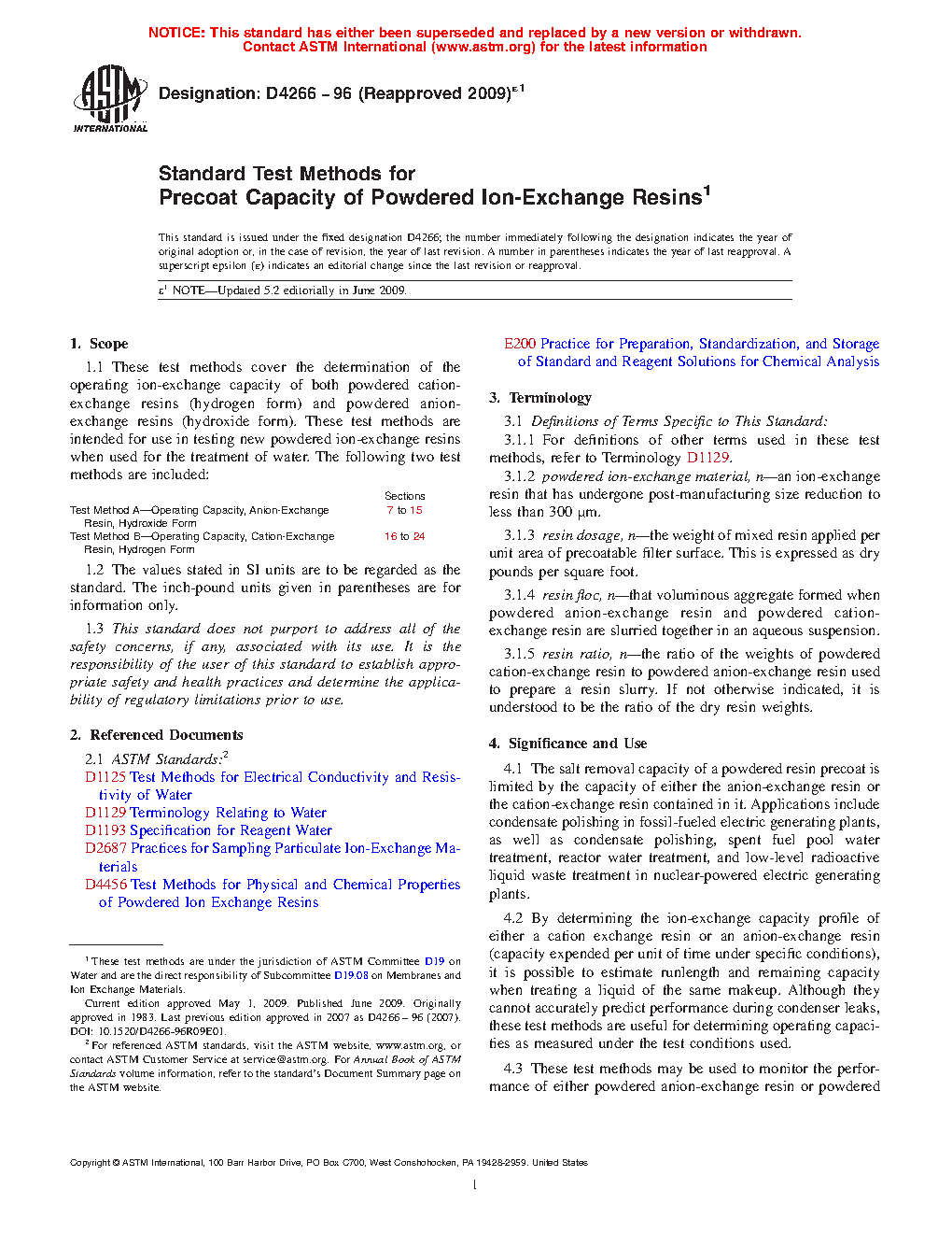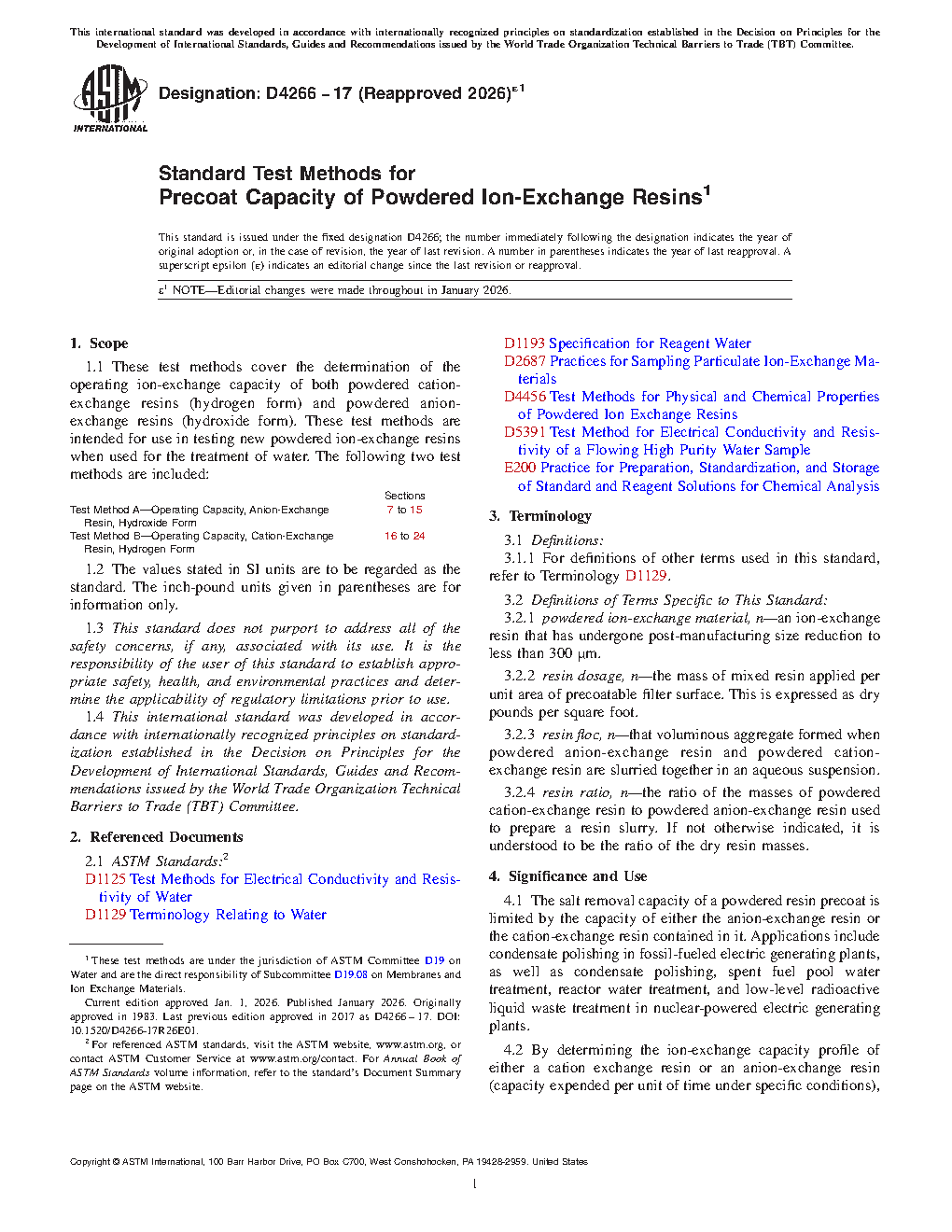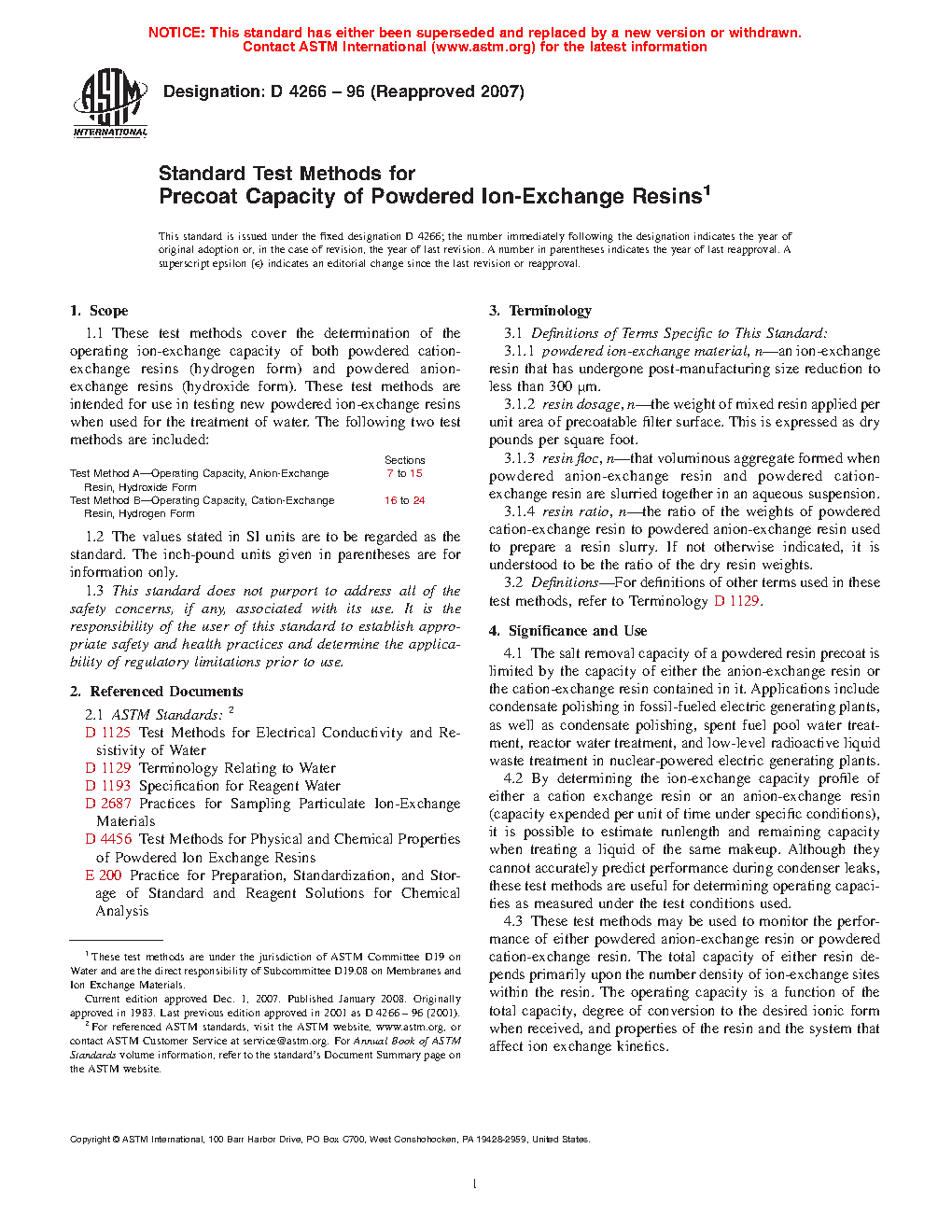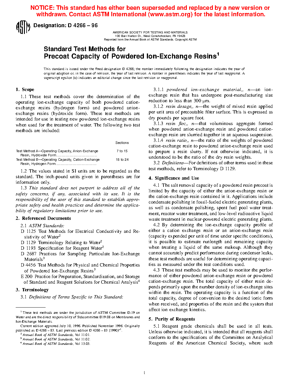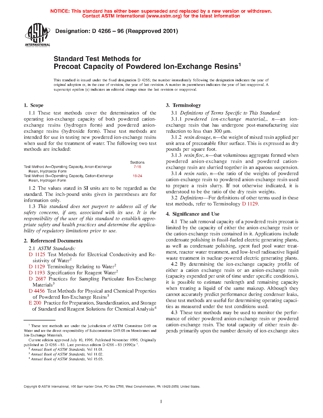 4.3 These test methods may be used to monitor the performance of either powdered anion-exchange resin or powdered cation-exchange resin. The total capacity of either resin depends primarily upon the number density of ion-exchange sites within the resin. The operating capacity is a function of the total capacity, degree of conversion to the desired ionic form when received, and properties of the resin and the system that affect ion exchange kinetics.
