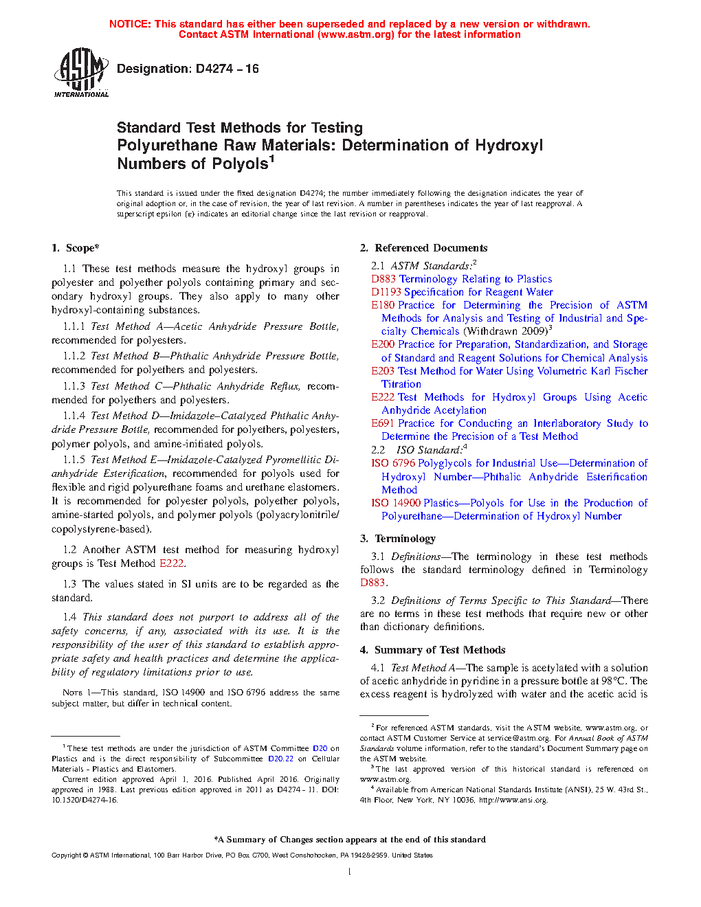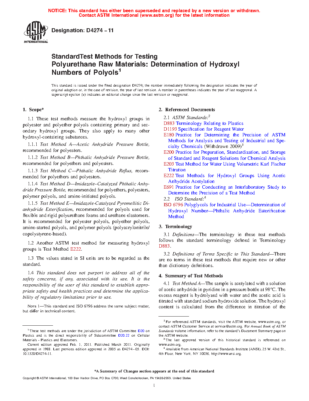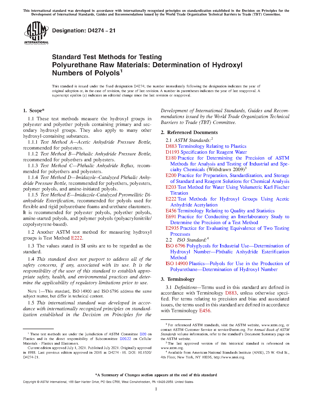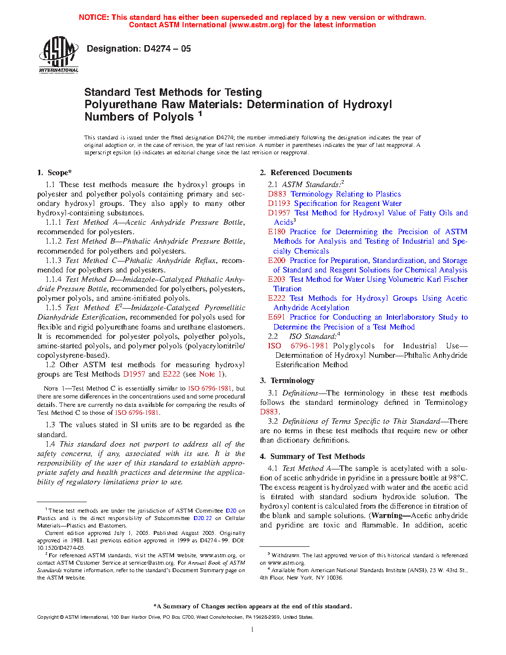 1.1 These test methods measure the hydroxyl groups in polyester and polyether polyols containing primary and secondary hydroxyl groups. They also apply to many other hydroxyl-containing substances.
