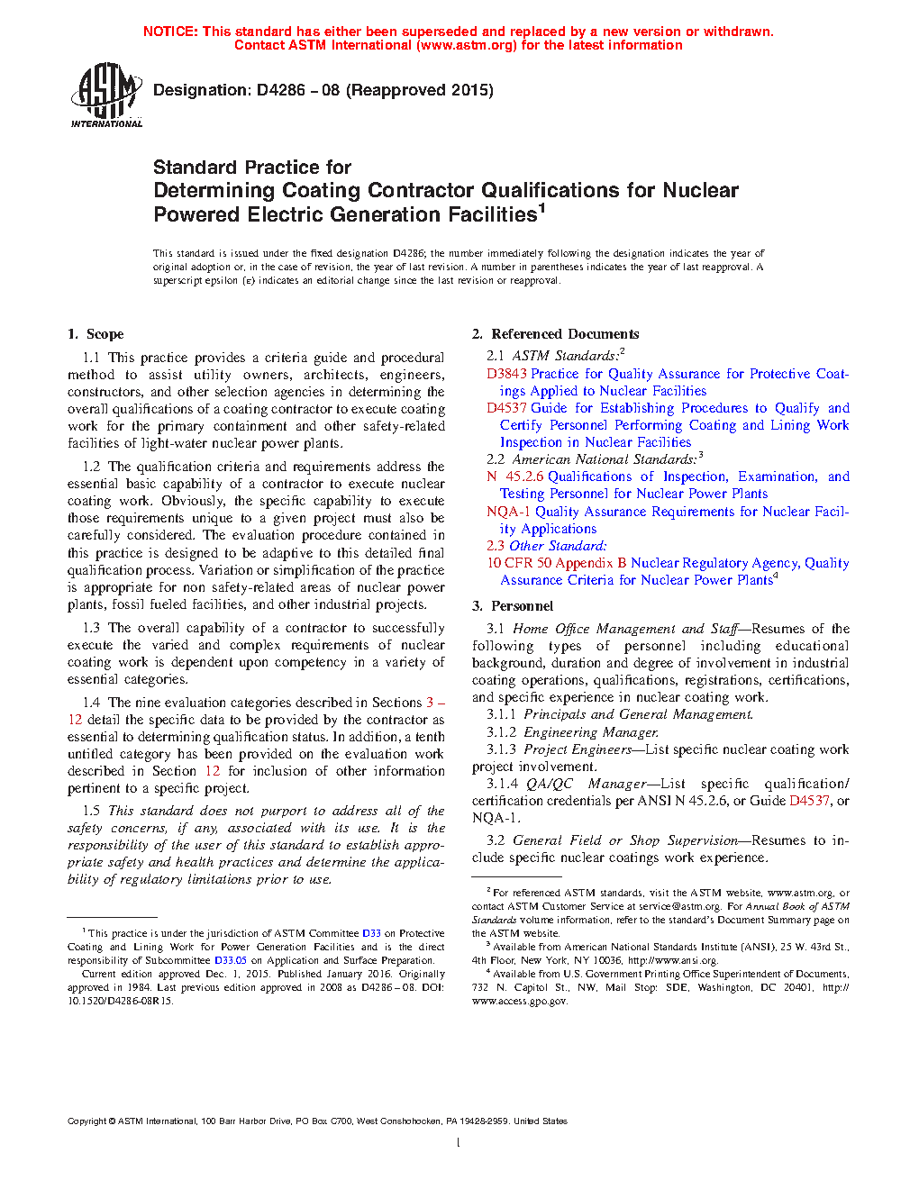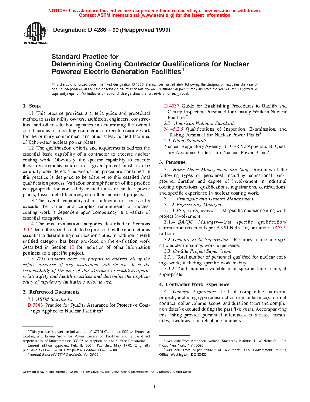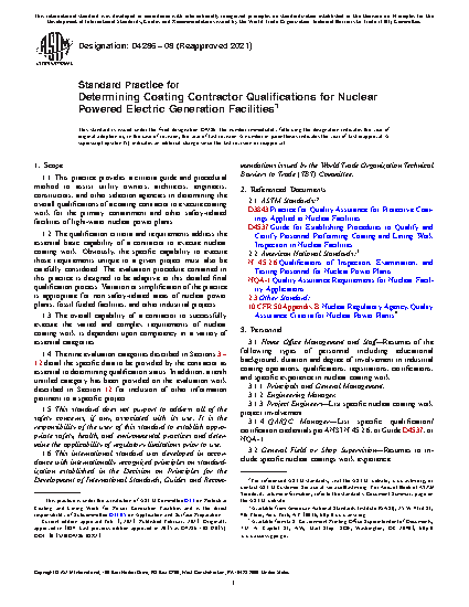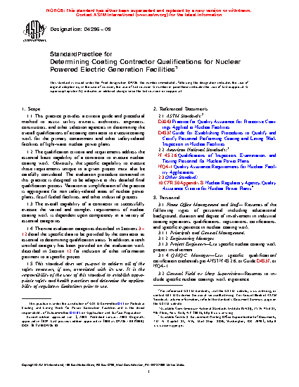 1.2 The qualification criteria and requirements address the essential basic capability of a contractor to execute nuclear coating work. Obviously, the specific capability to execute those requirements unique to a given project must also be carefully considered. The evaluation procedure contained in this practice is designed to be adaptive to this detailed final qualification process. Variation or simplification of the practice is appropriate for non safety-related areas of nuclear power plants, fossil fueled facilities, and other industrial projects.