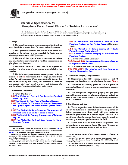 This specification covers the requirements for phosphate ester based fire resistant fluids for use in turbine lubrication. Only unused fluid is defined before it is installed in the turbine while fluids used in electrohydraulic control (EHC) systems is not. The use of this type of fluid is restricted to turbine systems that have been designed or modified to accommodate phosphate ester lubricants. Fire tests shall be performed which measure and describe the properties of the phosphate esters in response to heat and flame under controlled laboratory conditions and should not be considered or used for the description or appraisal of the fire hazard of the fluids under actual fire conditions.