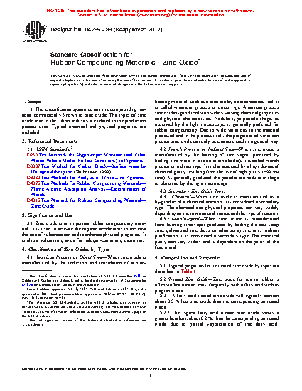 1.1 This classification system covers the compounding material commercially known as zinc oxide. The types of zinc oxide used in the rubber industry are related to the production process used. Typical chemical and physical properties are included.