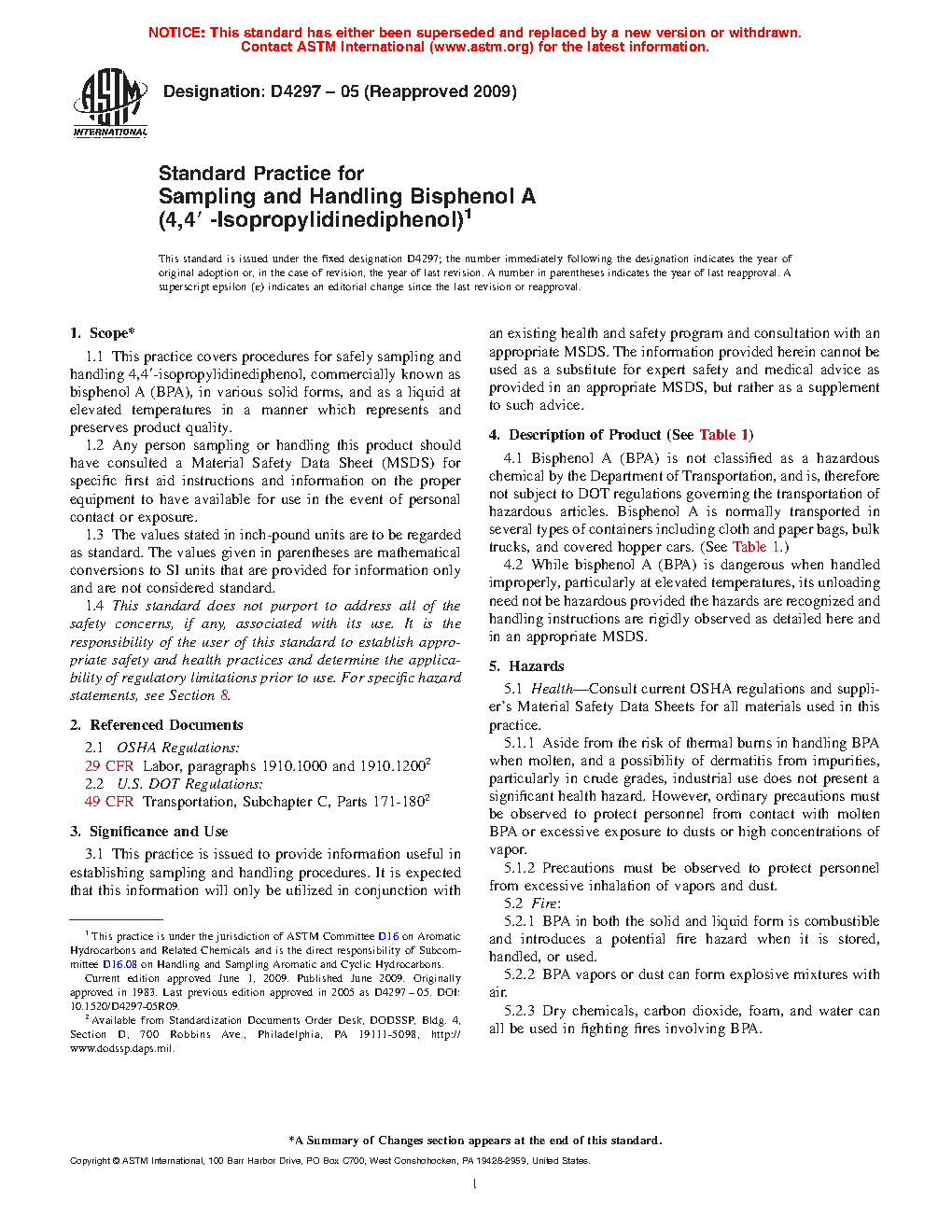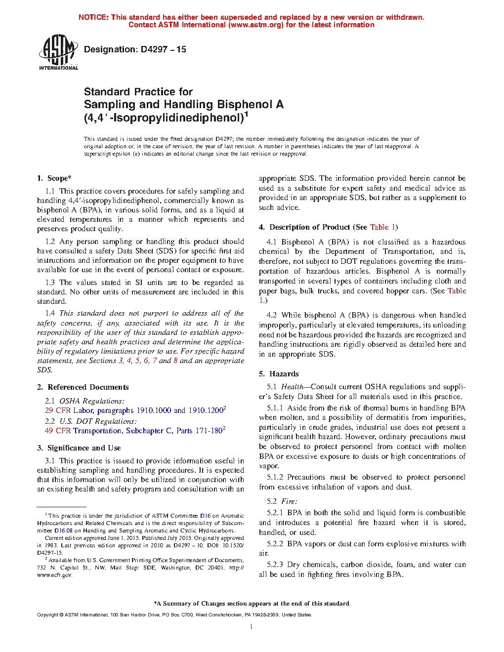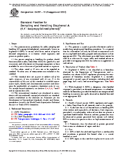 1.1 This practice covers procedures for safely sampling and handling 4,4'-isopropylidinediphenol, commercially known as bisphenol A (BPA), in various solid forms, and as a liquid at elevated temperatures in a manner which represents and preserves product quality.