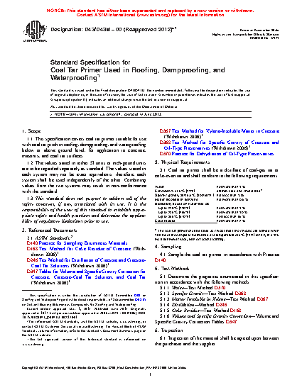 1.1 This specification covers coal tar primer suitable for use with coal tar pitch in roofing, dampproofing, and waterproofing below or above ground level, for application to concrete, masonry, and coal tar surfaces.
