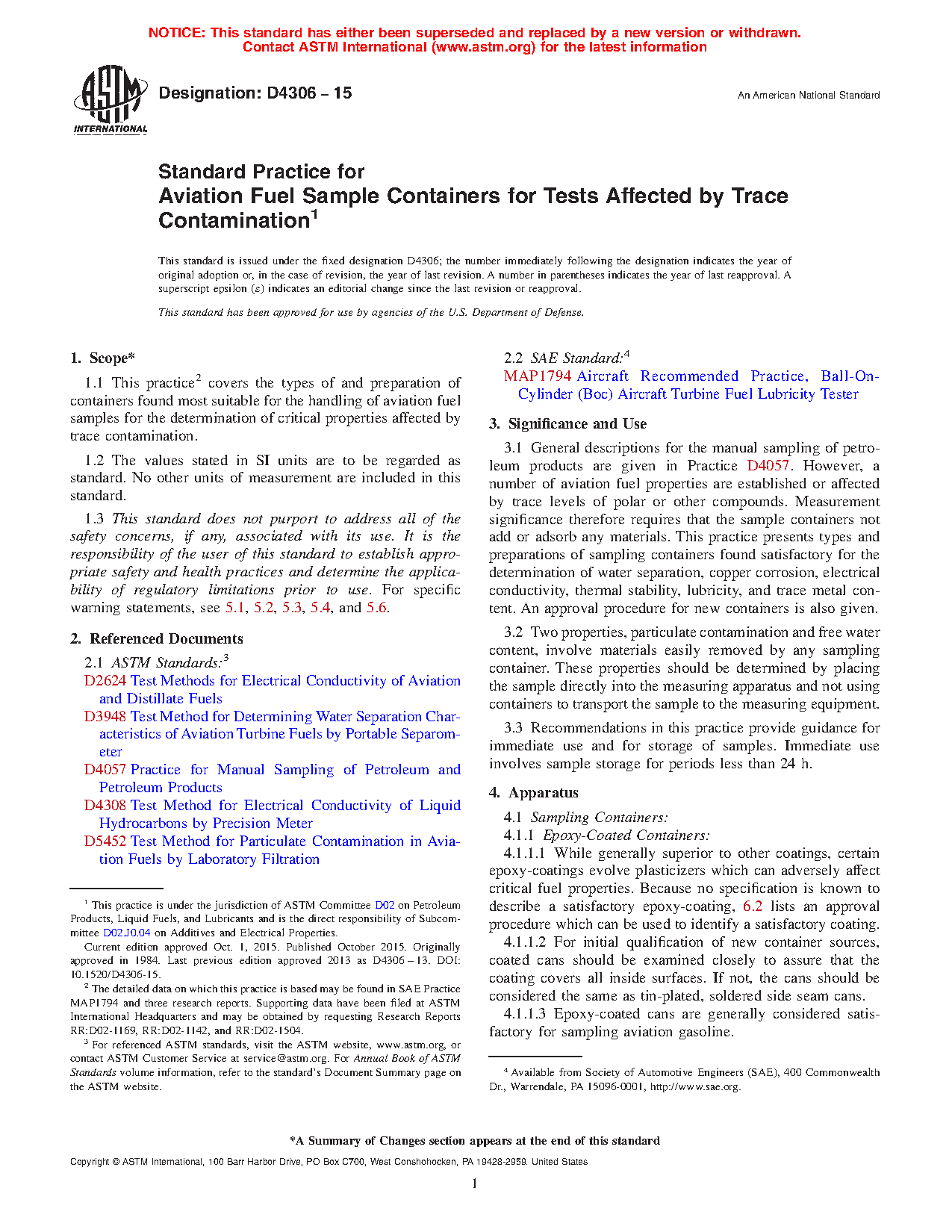 3.1 General descriptions for the manual sampling of petroleum products are given in Practice D4057. However, a number of aviation fuel properties are established or affected by trace levels of polar or other compounds. Measurement significance therefore requires that the sample containers not add or adsorb any materials. This practice presents types and preparations of sampling containers found satisfactory for the determination of water separation, copper corrosion, electrical conductivity, thermal stability, lubricity, and trace metal content. The choice of construction materials is an important factor, particularly in the case of aviation turbine fuel, where thermal stability can be degraded by the presence of very low concentrations of copper. The use of copper or copper based alloys shall be eliminated from aviation sampling apparatus. An approval procedure for new containers is also given.