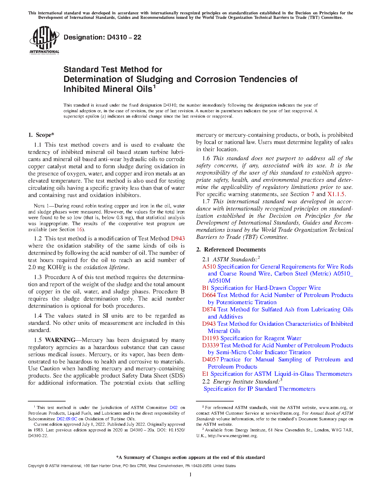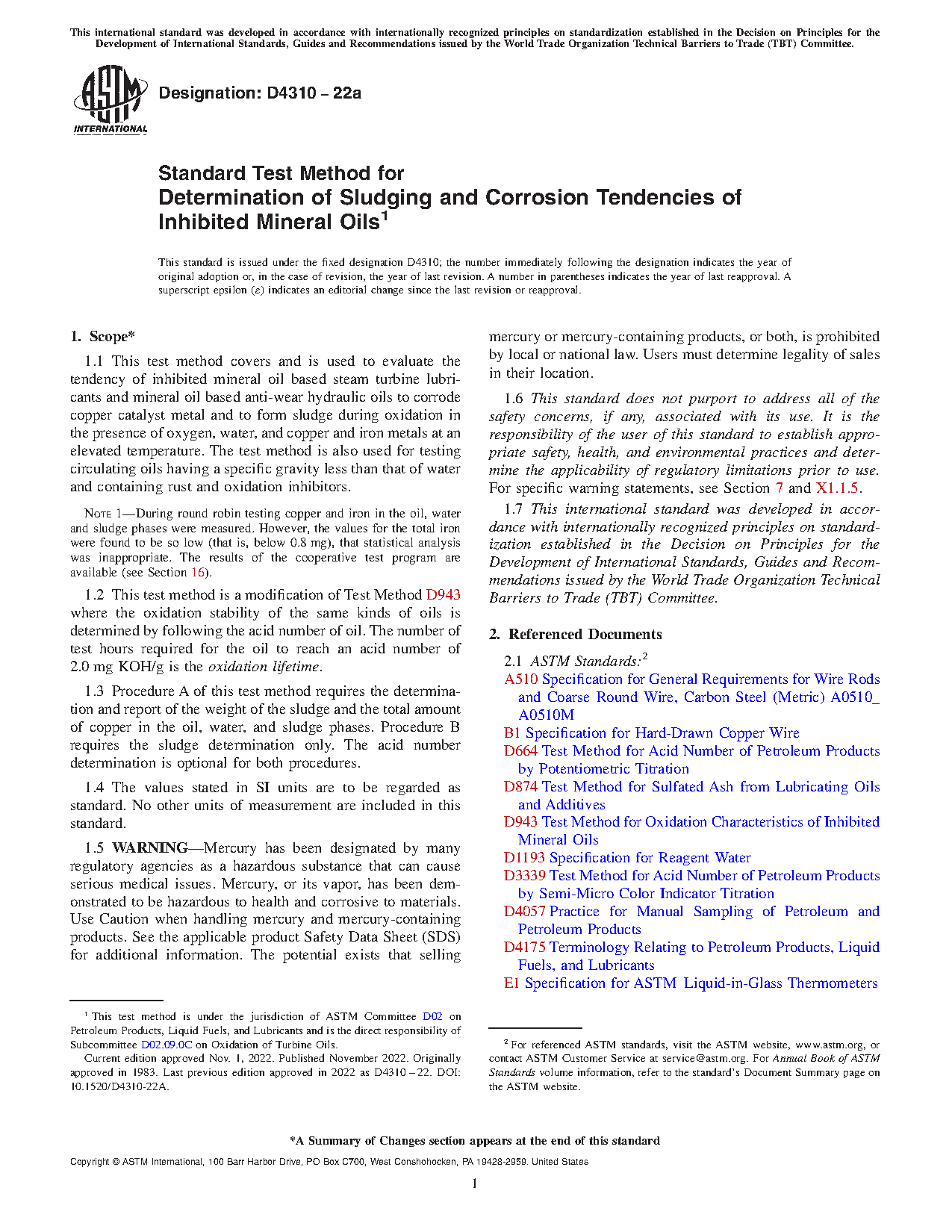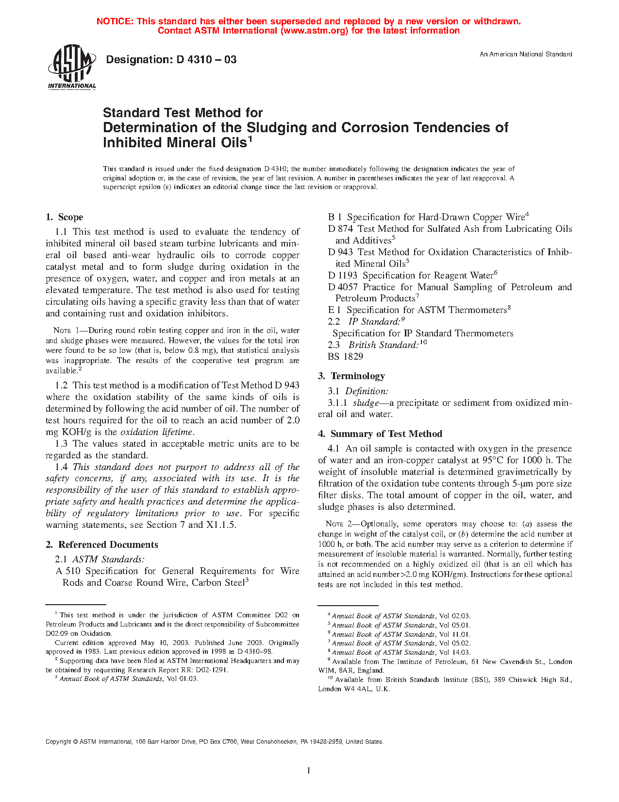 1.2 This test method is a modification of Test Method D 943 where the oxidation stability of the same kinds of oils is determined by following the acid number of oil. The number of test hours required for the oil to reach an acid number of 2.0 mg KOH/g is the oxidation lifetime.