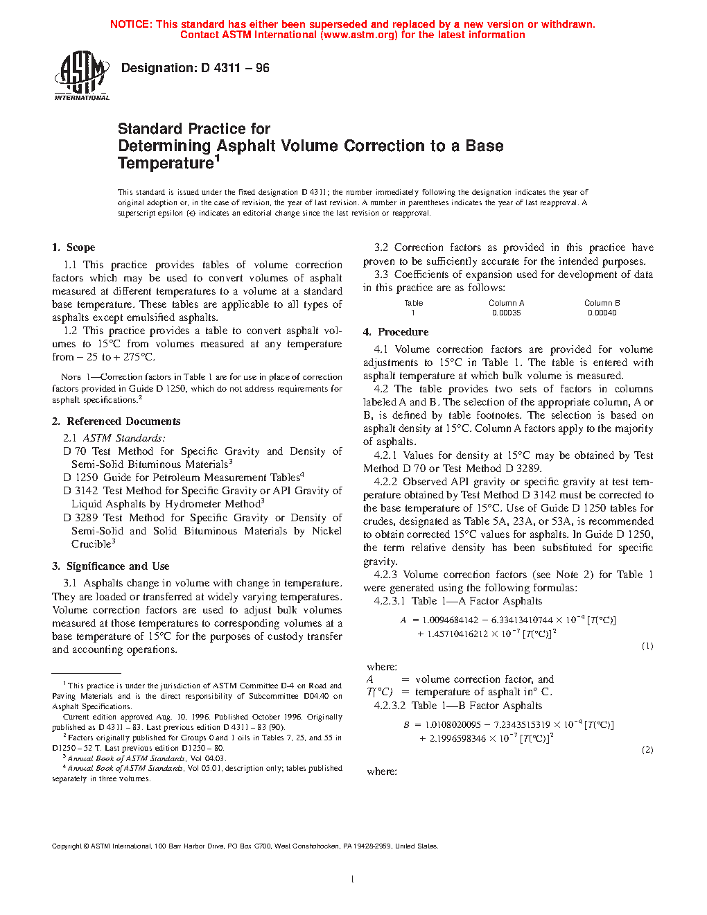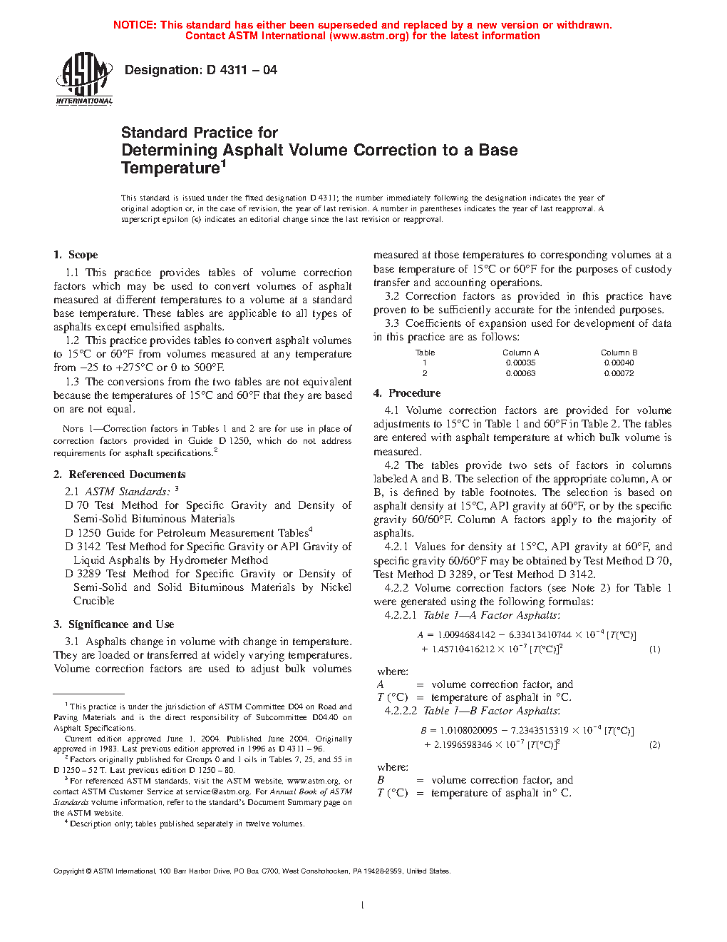 1.1 This practice provides tables of volume correction factors which may be used to convert volumes of asphalt measured at different temperatures to a volume at a standard base temperature. These tables are applicable to all types of asphalts except emulsified asphalts.