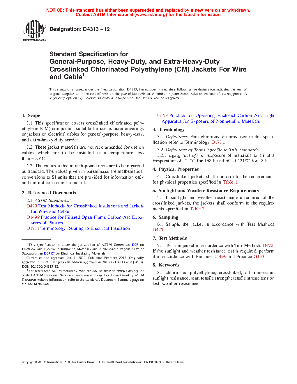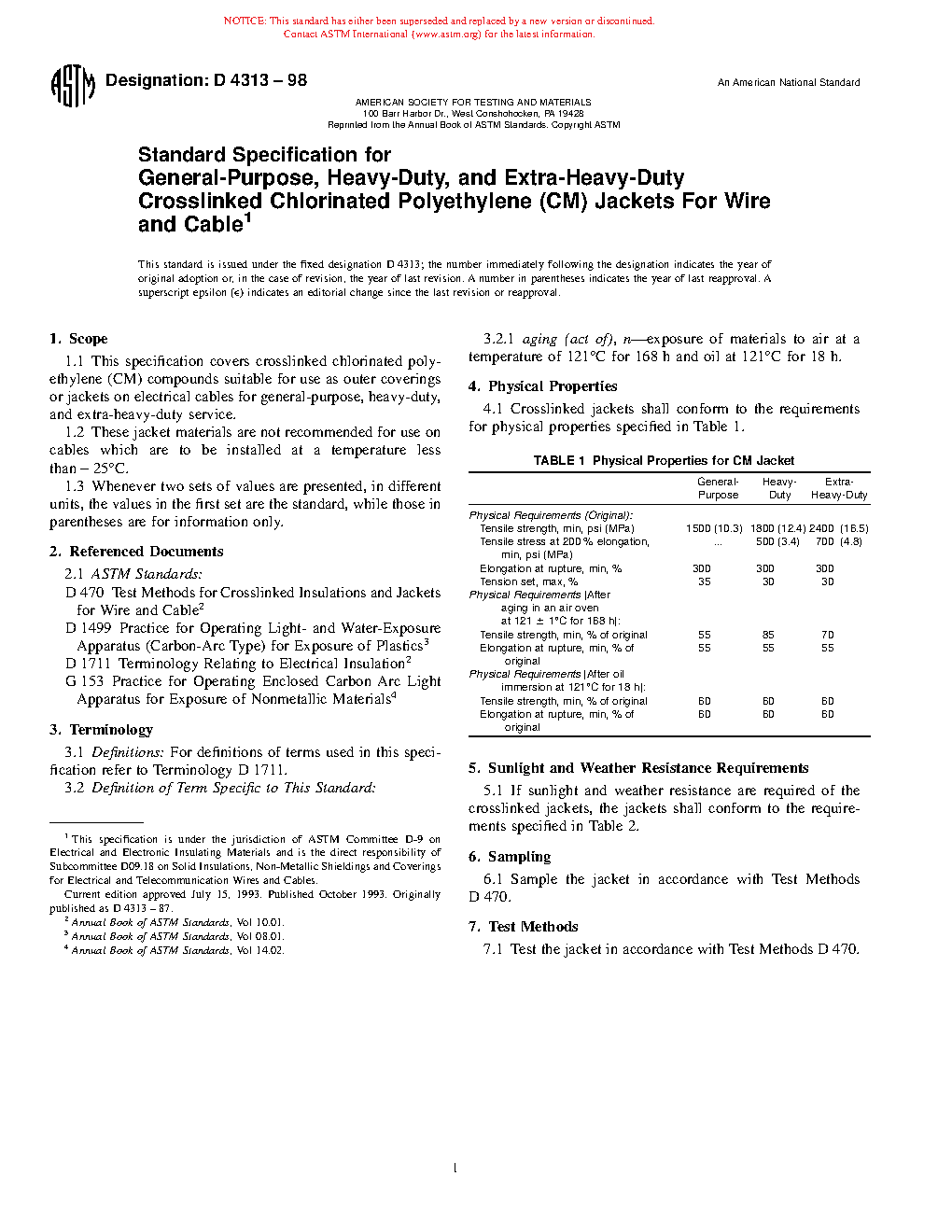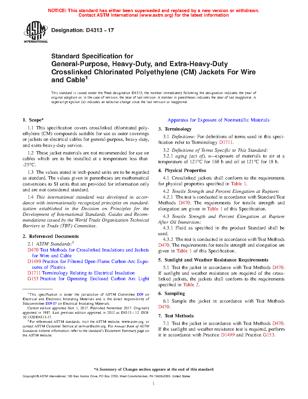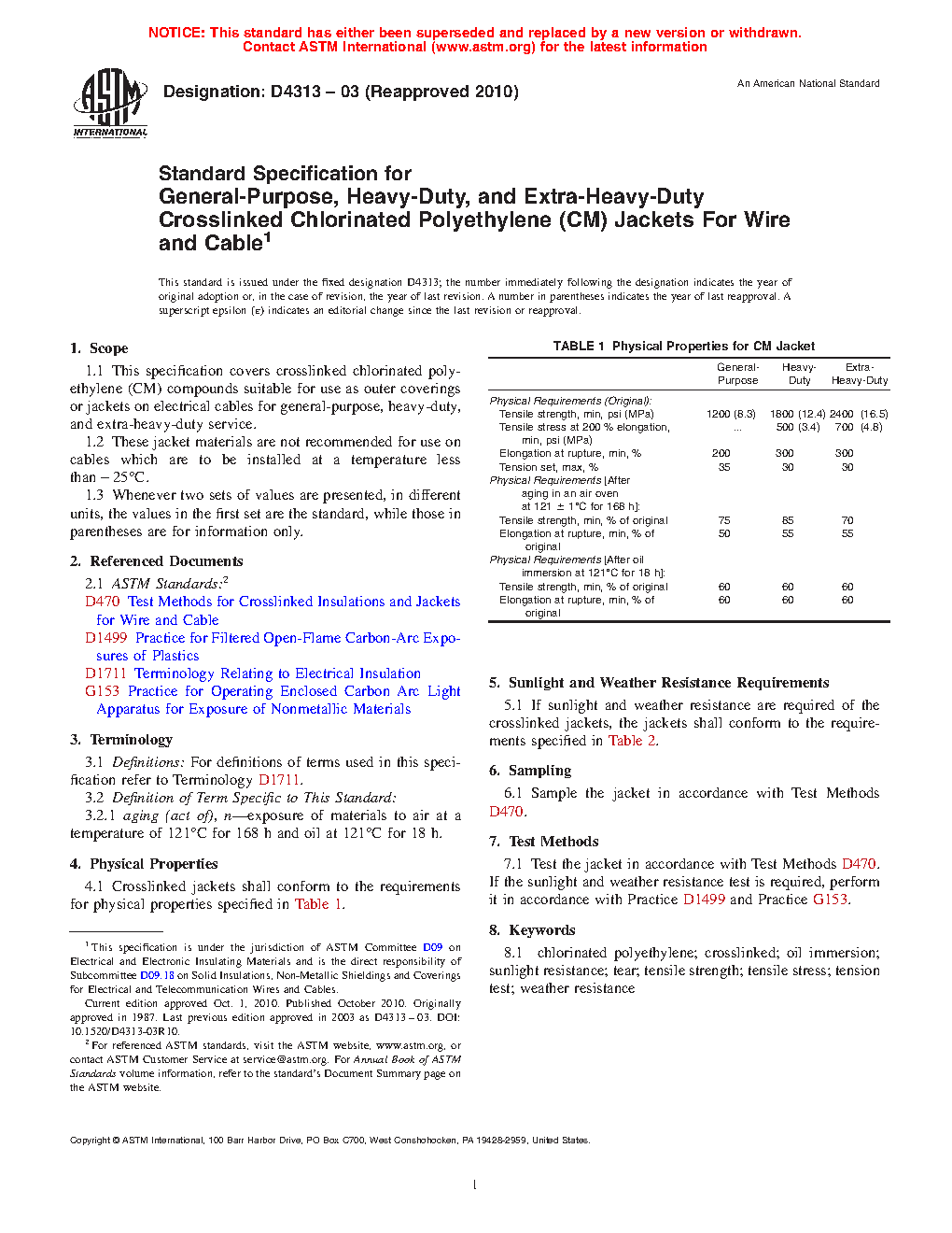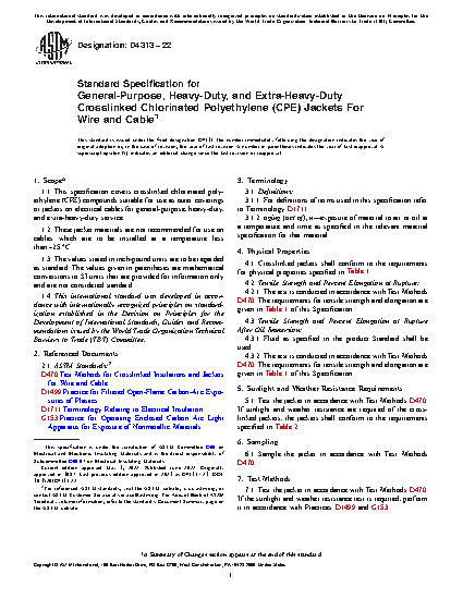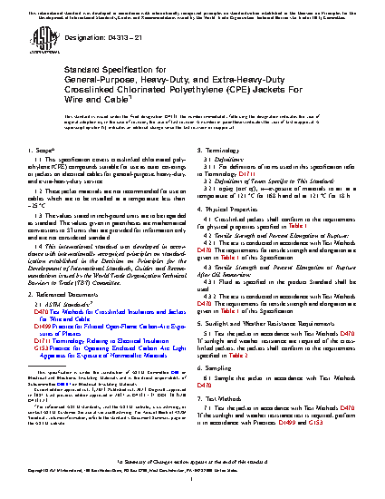 1.1 This specification covers crosslinked chlorinated polyethylene (CPE) compounds suitable for use as outer coverings or jackets on electrical cables for general-purpose, heavy-duty, and extra-heavy-duty service.