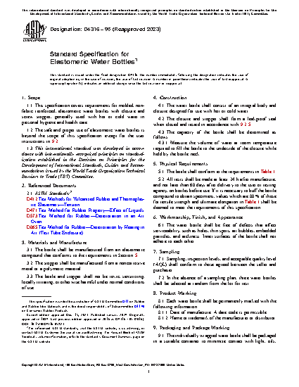 1.1 This specification covers requirements for molded, non-fabric reinforced, elastomeric water bottles with closure and screw stopper, generally used with hot or cold water in personal hygiene and health care.