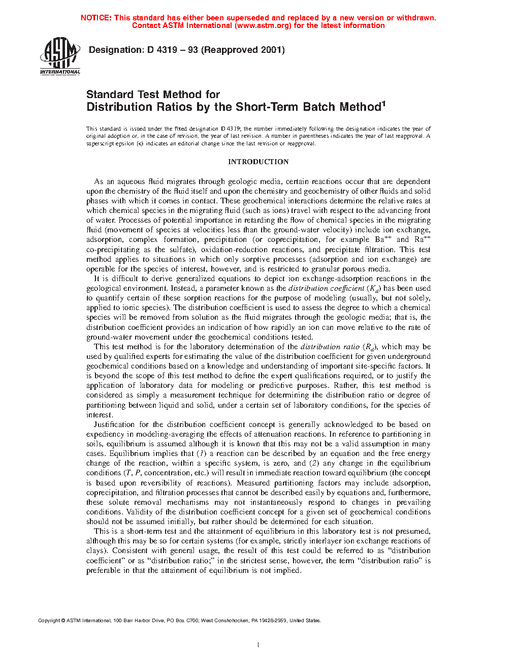 1.1 This test method covers the determination of distribution ratios of chemical species for site-specific geological media by a batch sorption technique. It is a short-term laboratory method primarily intended for ionic species subject to migration in granular porous material, and the application of the results to long-term field behavior is not known. Distribution ratios for radionuclides in selected geomedia are commonly determined for the purpose of assessing potential migratory behavior at waste repositories. This test method is also applicable to studies of intrusion waters and for parametric studies of the effects of variables and of mechanisms which determine the measured distribution ratios.