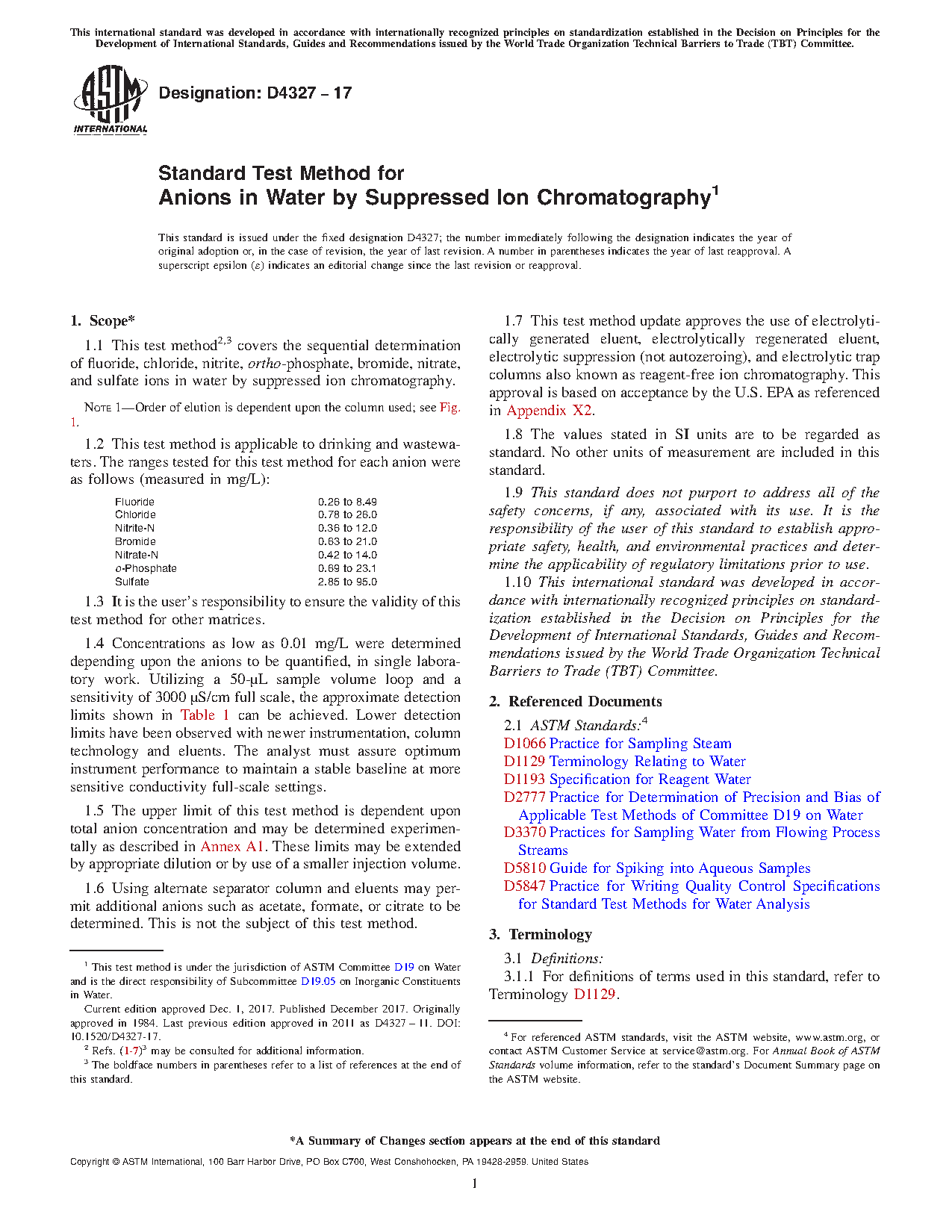 1.1 This test method covers the sequential determination of fluoride, chloride, nitrite, ortho-phosphate, bromide, nitrate, and sulfate ions in water by suppressed ion chromatography.
