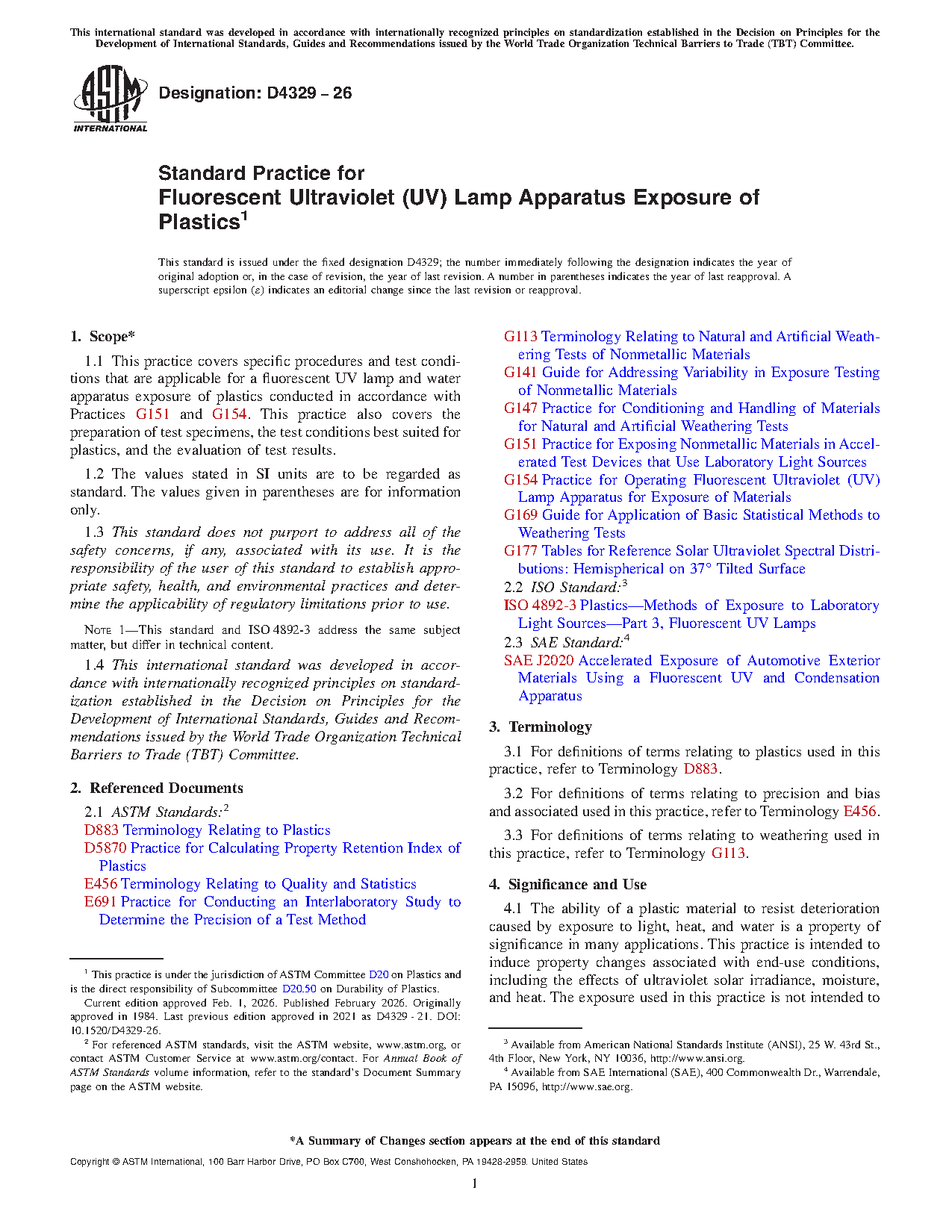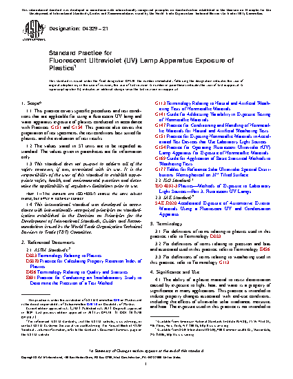 1.1 This practice covers specific procedures and test conditions that are applicable for fluorescent UV exposure of plastics conducted in accordance with Practices G151 and G154. This practice also covers the preparation of test specimens, the test conditions best suited for plastics, and the evaluation of test results.
