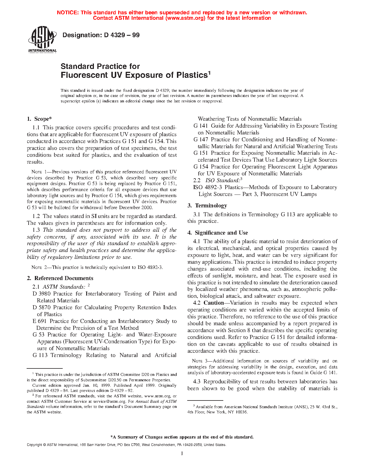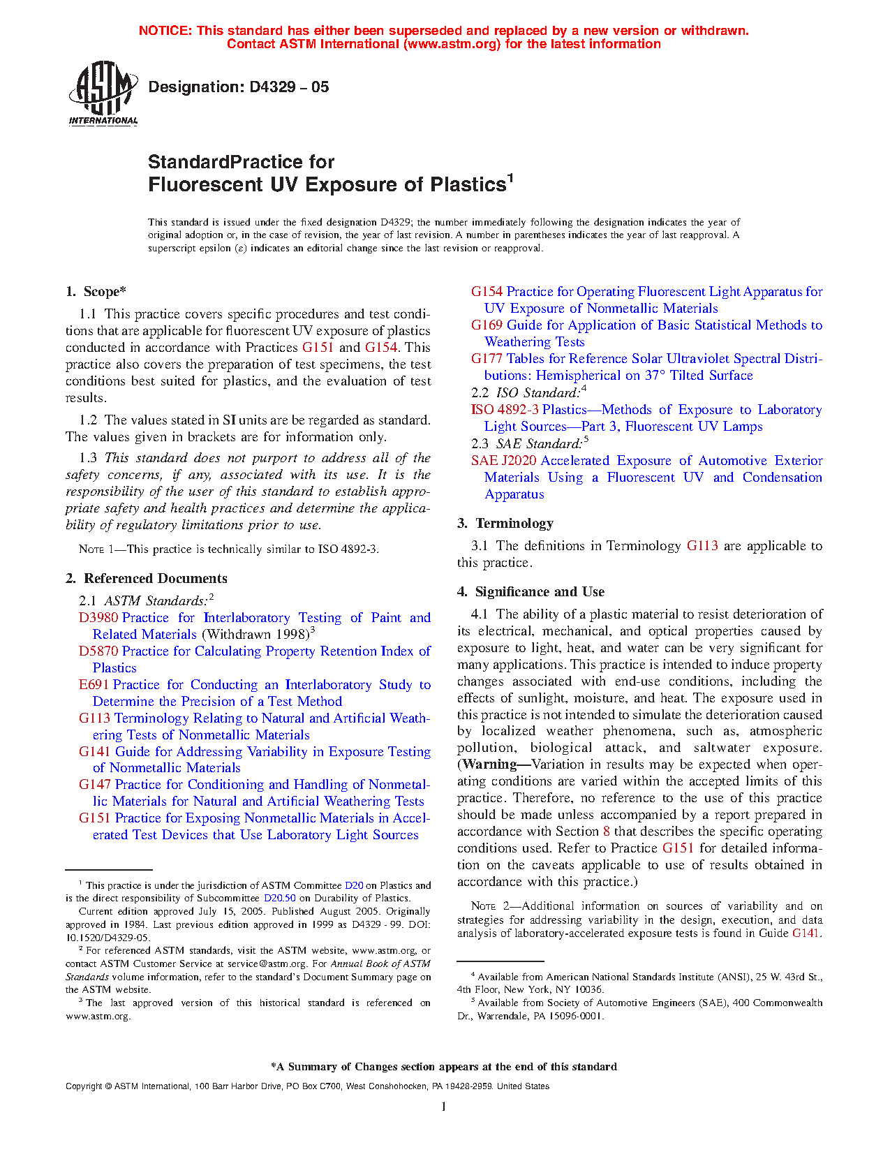 4.1 The ability of a plastic material to resist deterioration of its electrical, mechanical, and optical properties caused by exposure to light, heat, and water can be very significant for many applications. This practice is intended to induce property changes associated with end-use conditions, including the effects of ultraviolet solar irradiance, moisture, and heat. The exposure used in this practice is not intended to simulate the deterioration caused by localized weather phenomena, such as, atmospheric pollution, biological attack, and saltwater exposure. (Warning—Variation in results may be expected when operating conditions are varied within the accepted limits of this practice. Therefore, no reference to the use of this practice should be made unless accompanied by a report prepared in accordance with Section 8 that describes the specific operating conditions used. Refer to Practice G151 for detailed information on the caveats applicable to use of results obtained in accordance with this practice.)