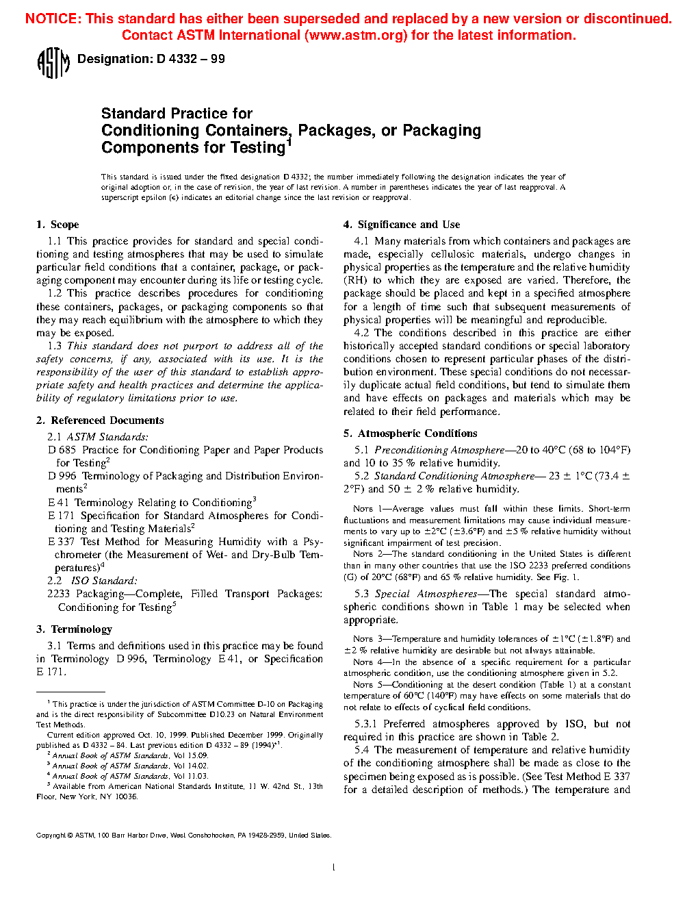 1.2 This practice describes procedures for conditioning these containers, packages, or packaging components so that they approach or reach equilibrium with the atmosphere to which they may be exposed. This standard is commonly used for conditioning when conducting transit simulation tests.
