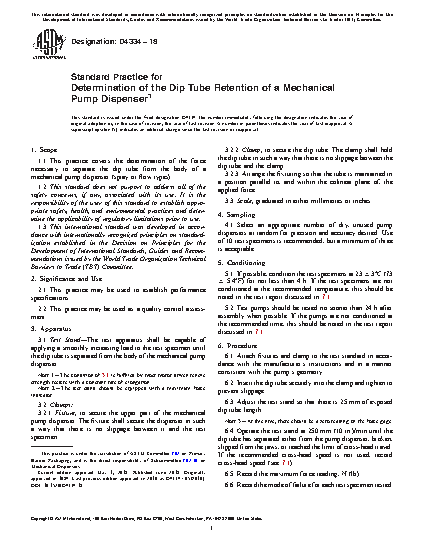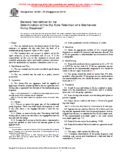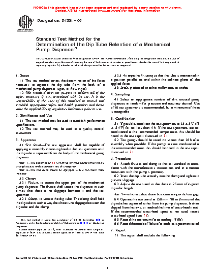 1.1 This practice covers the determination of the force necessary to separate the dip tube from the body of a mechanical pump dispenser (spray or flow types).
