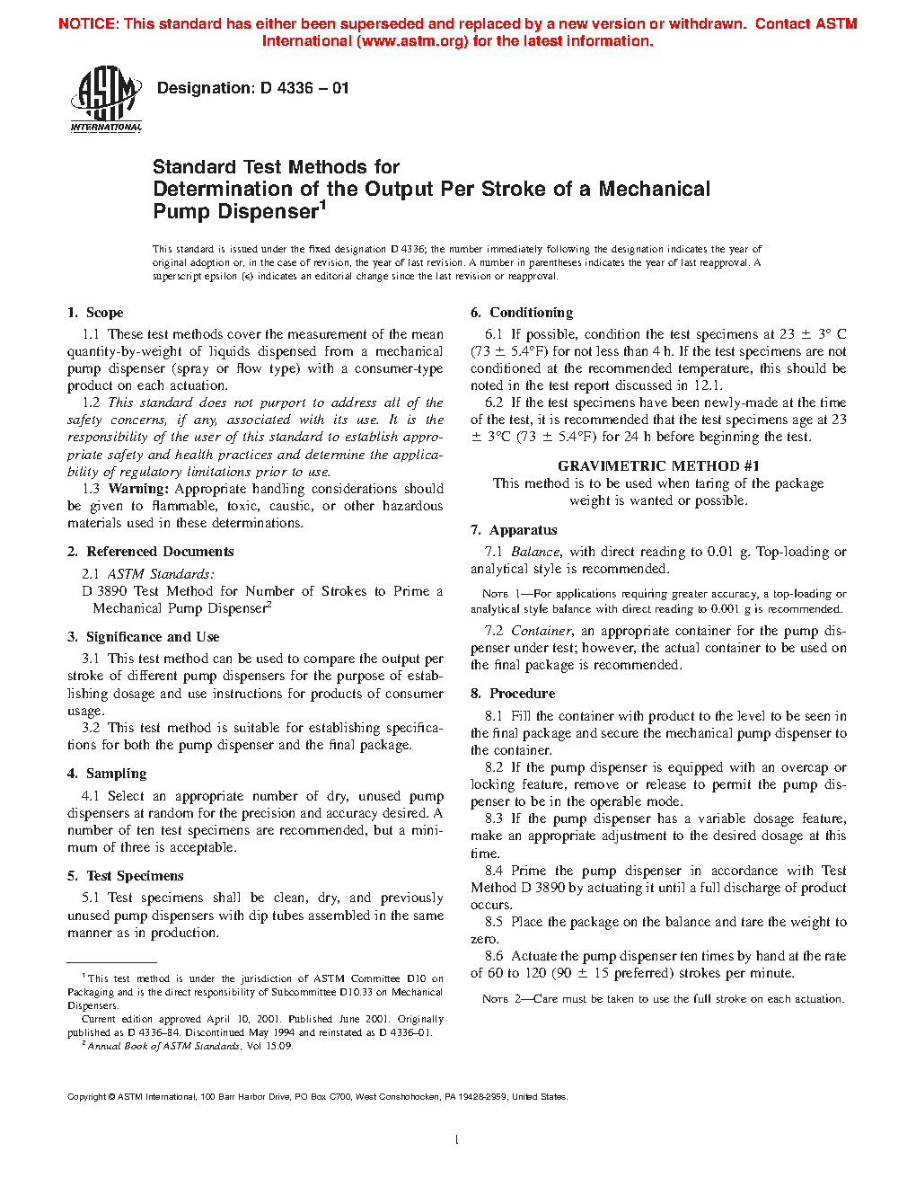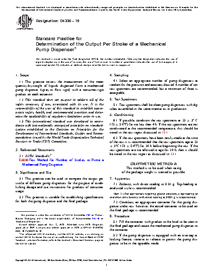Standard Test Methods for Determination of the Output Per Stroke of a Mechanical Pump Dispenser
