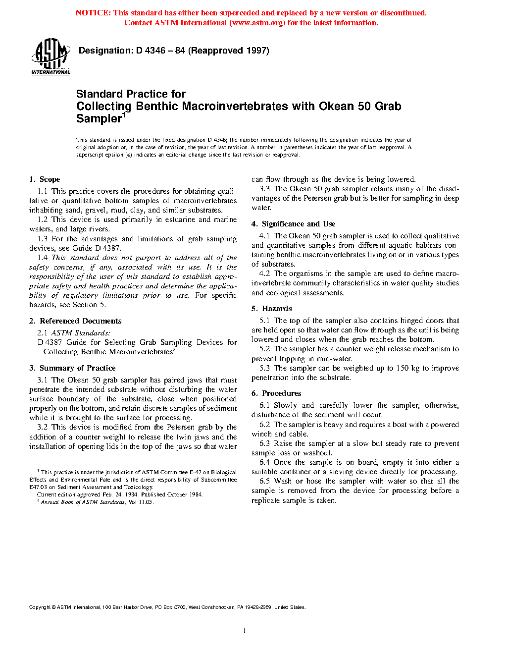 Standard Practice for Collecting Benthic Macroinvertebrates with Okean 50 Grab Sampler