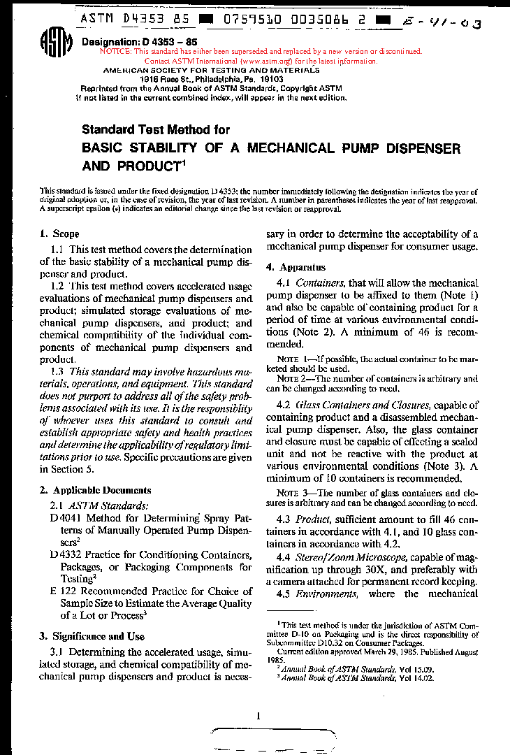 Test Method for Basic Stability of a mechanical Pump Dispenser and Product (Withdrawn 1995)