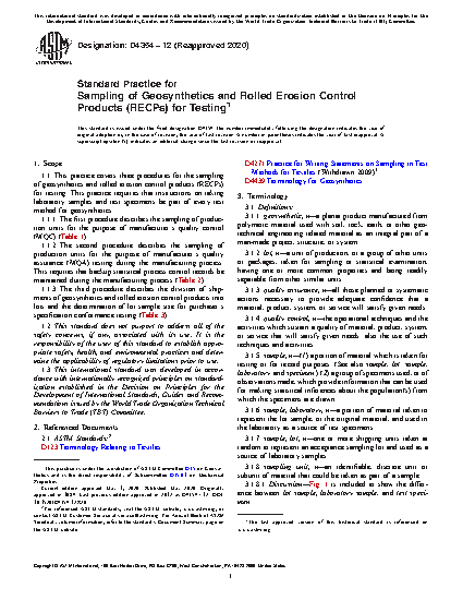 1.1 This practice covers three procedures for the sampling of geosynthetics and rolled erosion control products (RECPs) for testing. This practice requires that instructions on taking laboratory samples and test specimens be part of every test method for geosynthetics.