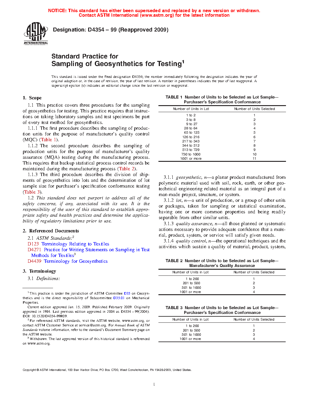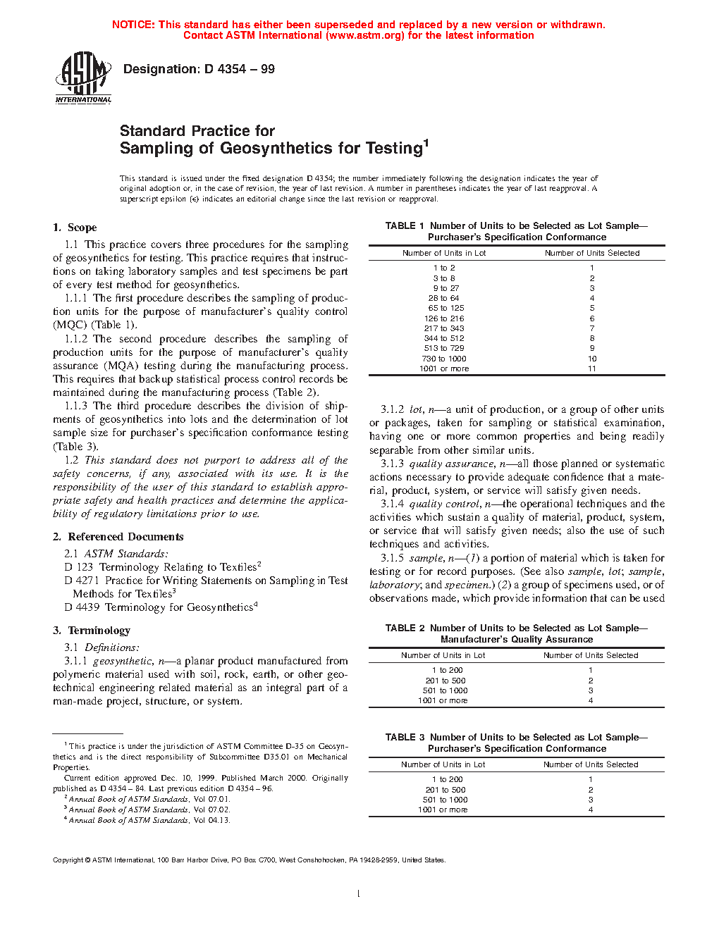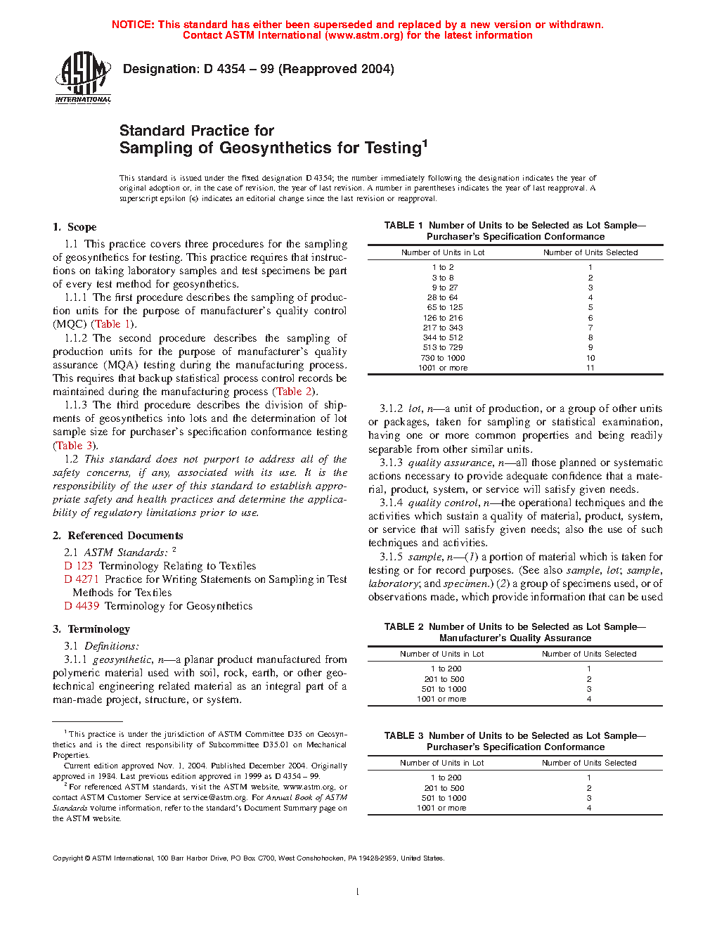 1.1.3 The third procedure describes the division of shipments of geosynthetics and rolled erosion control products into lots and the determination of lot sample size for purchaser's specification conformance testing (Table 3).