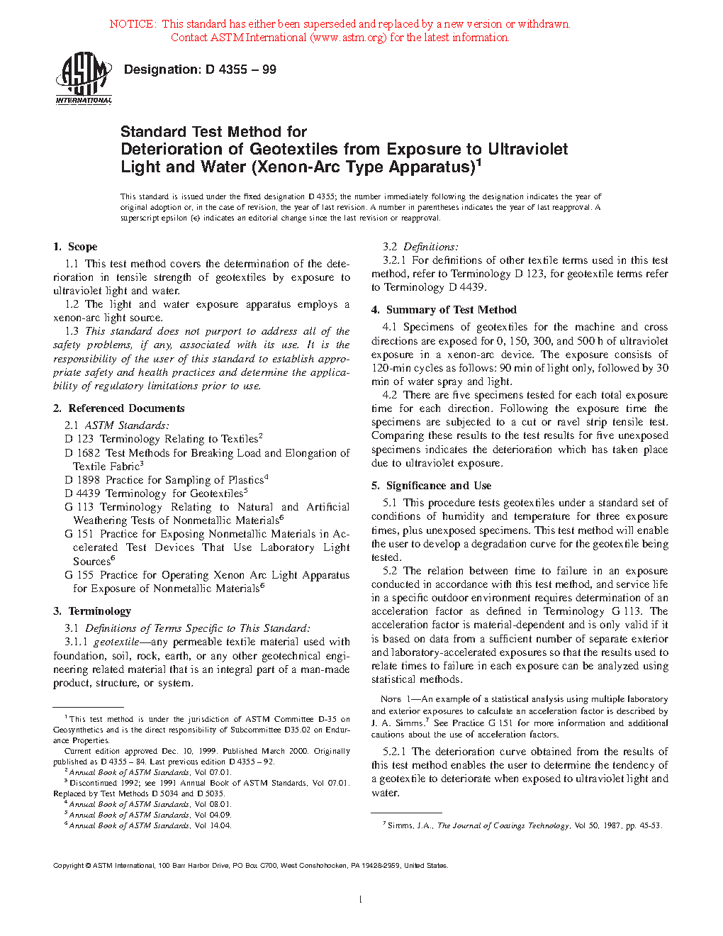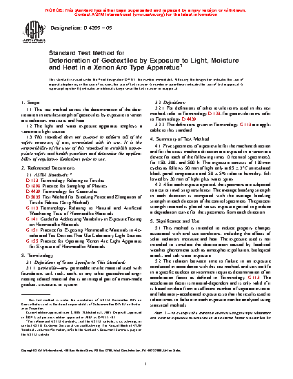 Standard Test Method for Deterioration of Geotextiles by Exposure to Light, Moisture and Heat in a Xenon Arc Type Apparatus