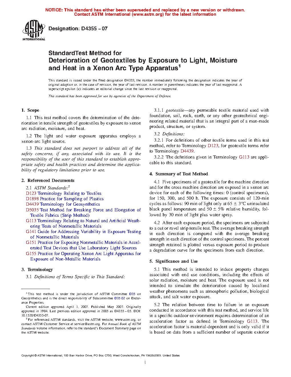 1.1 This test method covers the determination of the deterioration in tensile strength of geotextiles by exposure to xenon arc radiation, moisture, and heat.