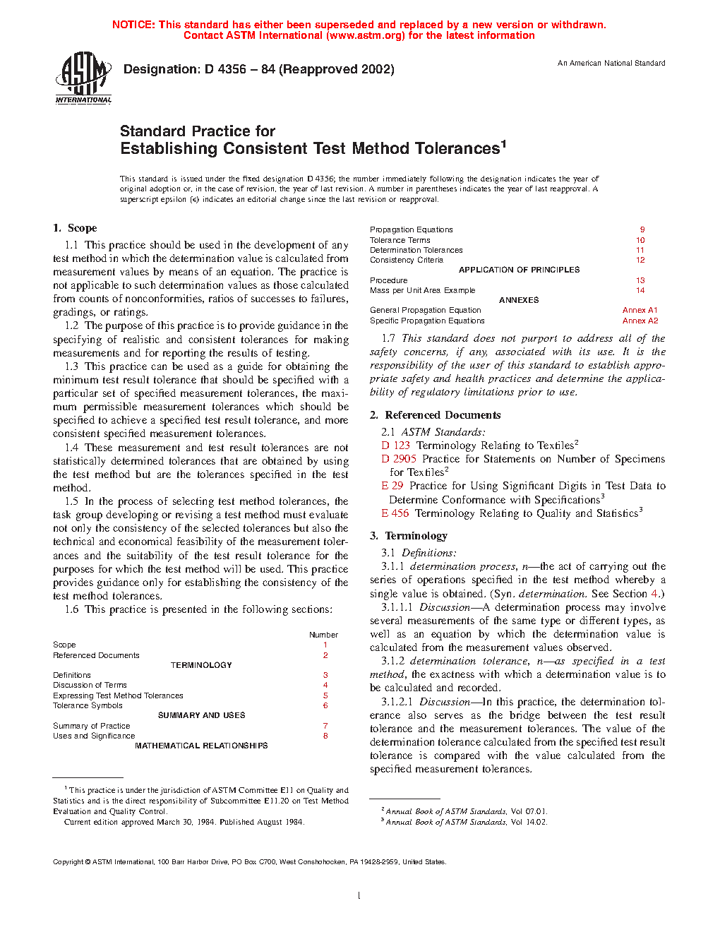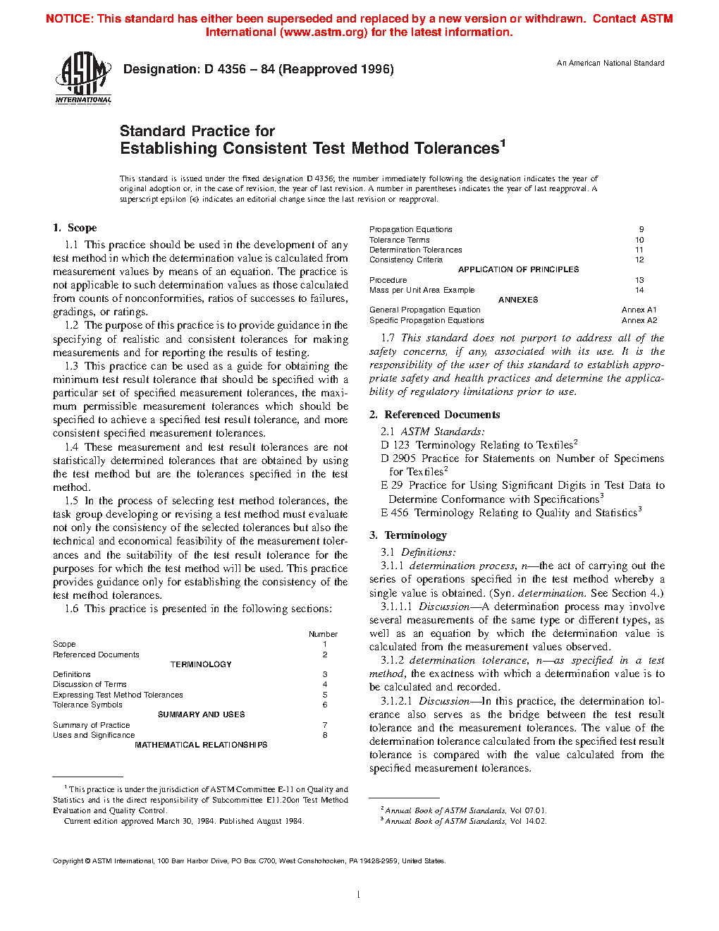 Number Scope 1 Referenced Documents 2 TERMINOLOGY Definitions 3 Discussion of Terms 4 Expressing Test Method Tolerances 5 Tolerance Symbols 6 SUMMARY AND USES Summary of Practice 7 Uses and Significance 8 MATHEMATICAL RELATIONSHIPS Propagation Equations 9 Tolerance Terms 10 Determination Tolerances 11 Consistency Criteria 12 APPLICATION OF PRINCIPLES Procedure 13 Mass per Unit Area Example 14 ANNEXES General Propagation Equation1.7 This standard may involve hazardous materials, operations, and equipment. This standard does not purport to address all of the safety problems associated with its use. It is the responsibility of the user of this standard to establish appropriate safety and health practices and determine the applicability of regulatory limitations prior to use.