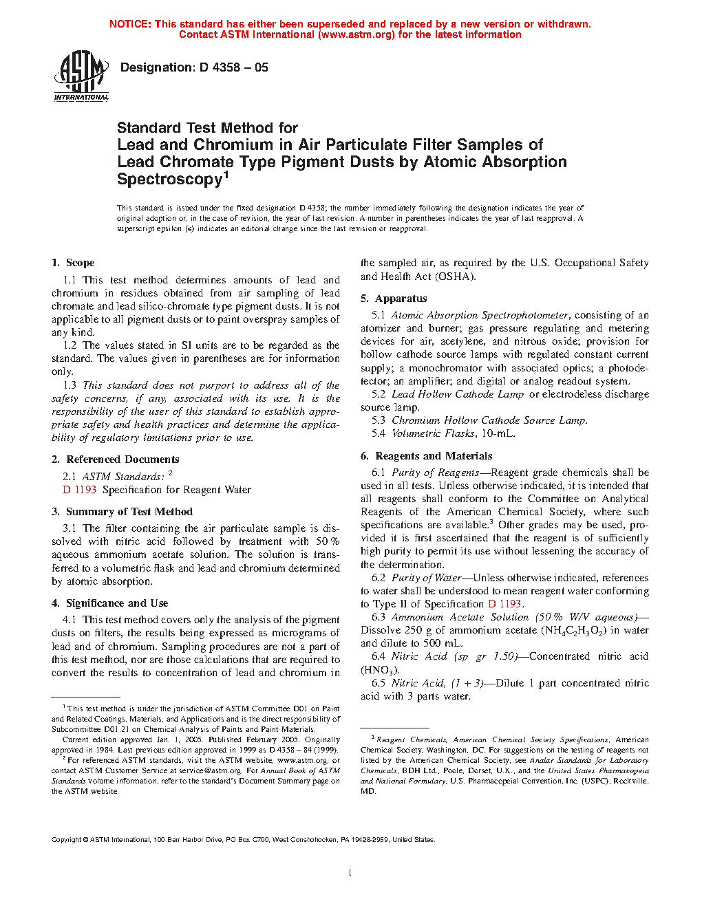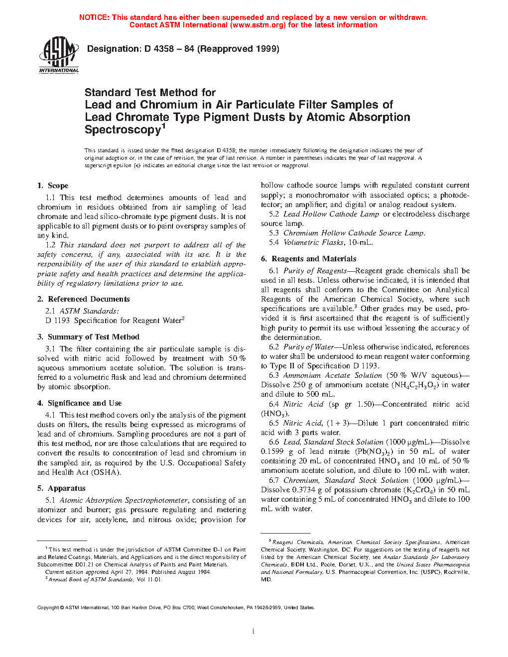 Standard Test Method for Lead and Chromium in Air Particulate Filter Samples of Lead Chromate Type Pigment Dusts by Atomic Absorption Spectroscopy