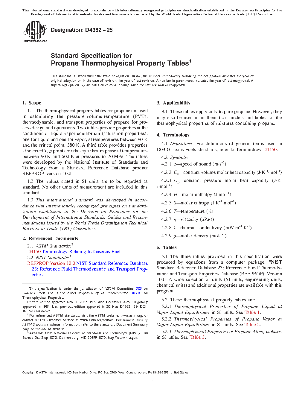 1.1 The thermophysical property tables for propane are for use in the calculation of the pressure-volume-temperature (PVT), thermodynamic, and transport properties of propane for process design and operations. Tables are provided for gaseous and liquid propane at temperatures between 90 and 600 K at pressures to 20 MPa. One table provides properties at the conditions of liquid-vapor equilibrium (saturation properties). The other table provides properties at selected T, p points for the equilibrium phase at those conditions. The tables were developed by the National Institute of Standards and Technology from a Standard Reference Database product REFPROP, version 8.0.