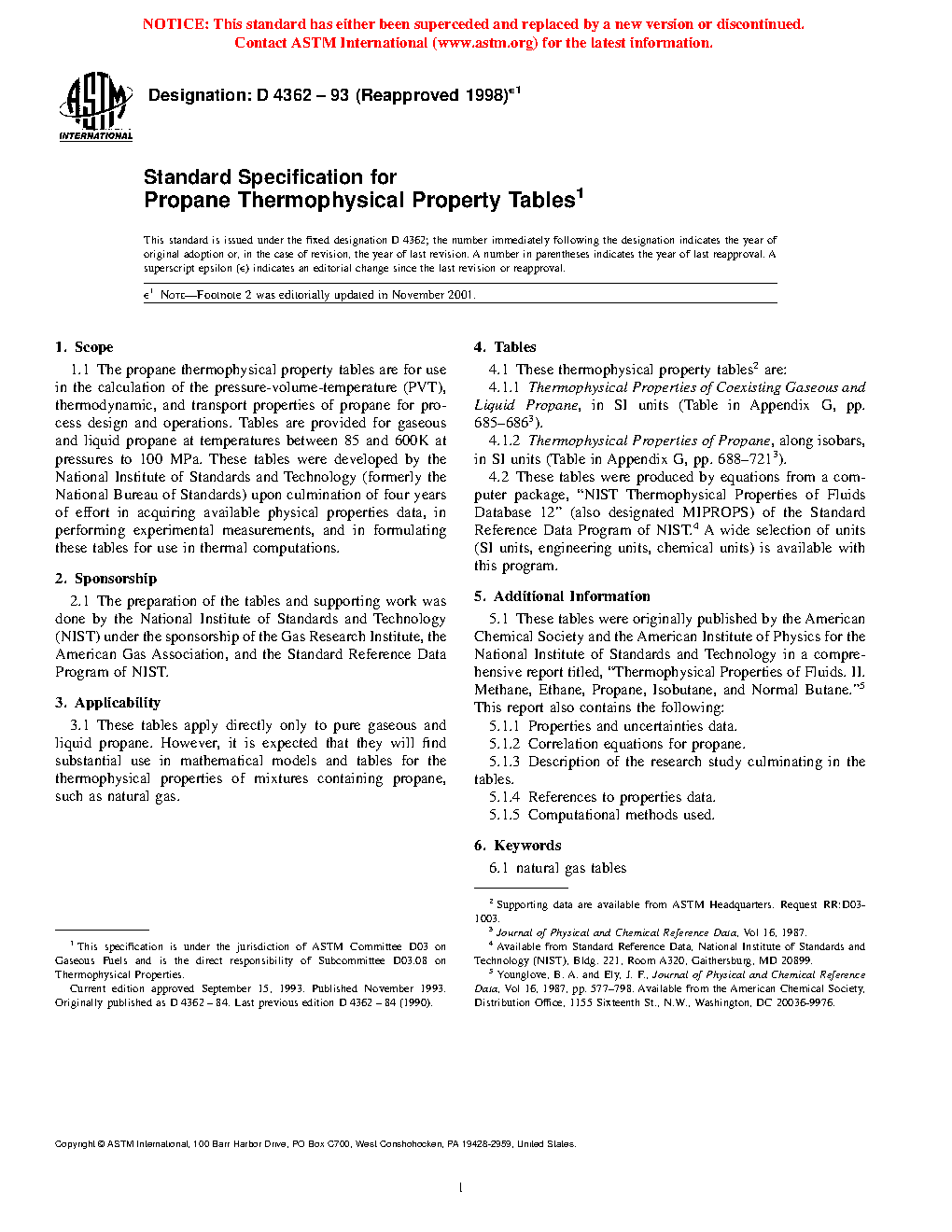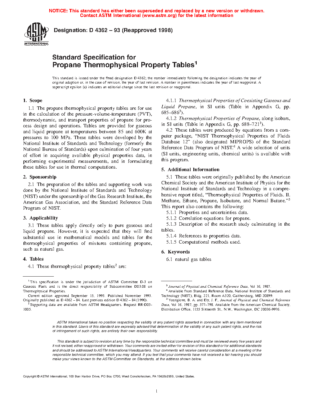 1.1 The propane thermophysical property tables are for use in the calculation of the pressure-volume-temperature (PVT), thermodynamic, and transport properties of propane for process design and operations. Tables are provided for gaseous and liquid propane at temperatures between 85 and 600 K at pressures to 100 MPa. These tables were developed by the National Institute of Standards and Technology (formerly the National Bureau of Standards) upon culmination of four years of effort in acquiring available physical properties data, in performing experimental measurements, and in formulating these tables for use in thermal computations.