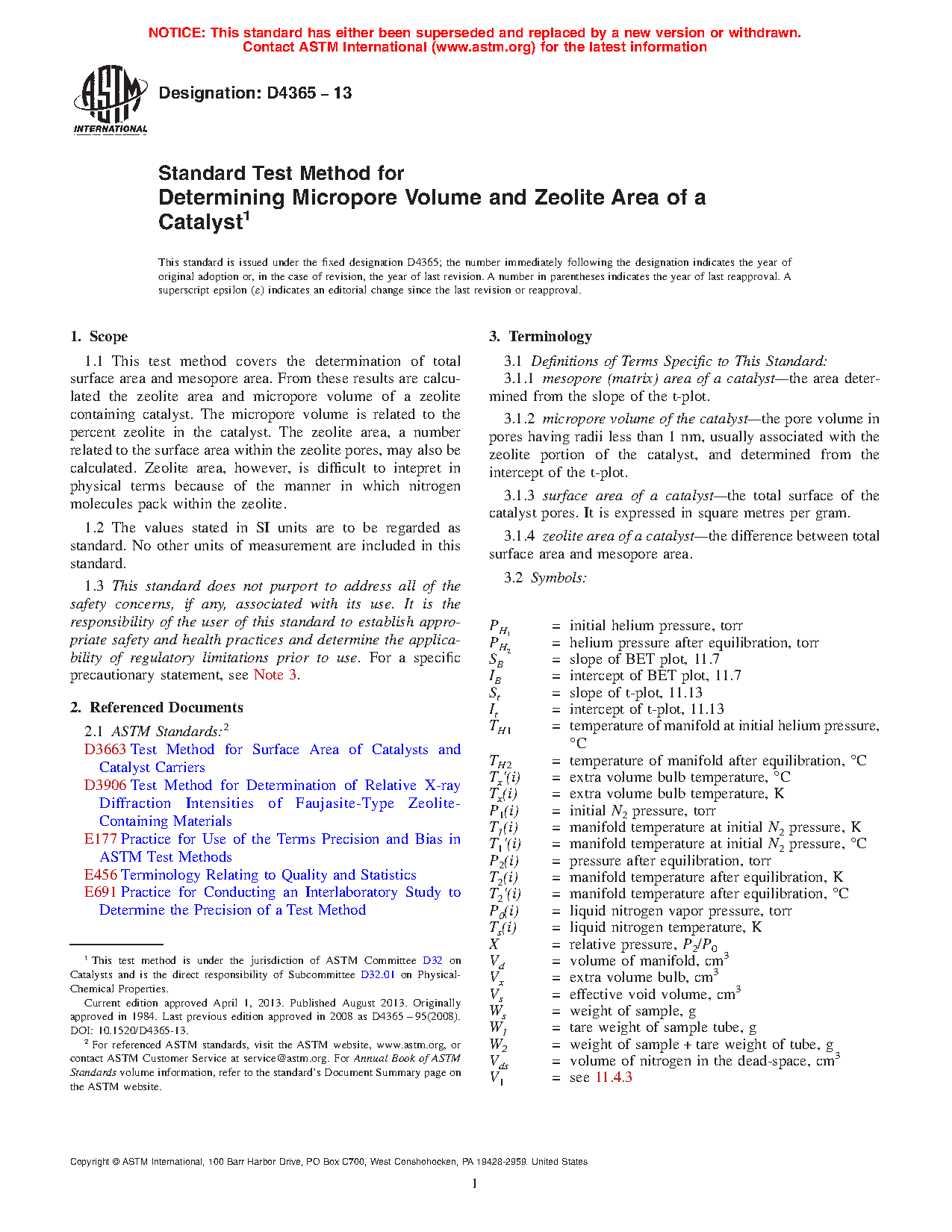 1.1 This test method covers the determination of total surface area and mesopore area. From these results are calculated the zeolite area and micropore volume of a zeolite containing catalyst. The micropore volume is related to the percent zeolite in the catalyst. The zeolite area, a number related to the surface area within the zeolite pores, may also be calculated. Zeolite area, however, is difficult to interpret in physical terms because of the manner in which nitrogen molecules pack within the zeolite.