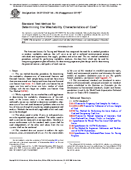 1.1 This test method describes procedures for determining the washability characteristics of coarse-coal fractions and fine-coal fractions. Each sample being tested can have more than one coarse-coal size fraction and more than one fine-coal size fraction (see Annex A1). Each such size fraction has an upper size limit and a lower size limit, neither of which overlaps with the next larger nor smaller size fraction. (See Test Method D4749.)