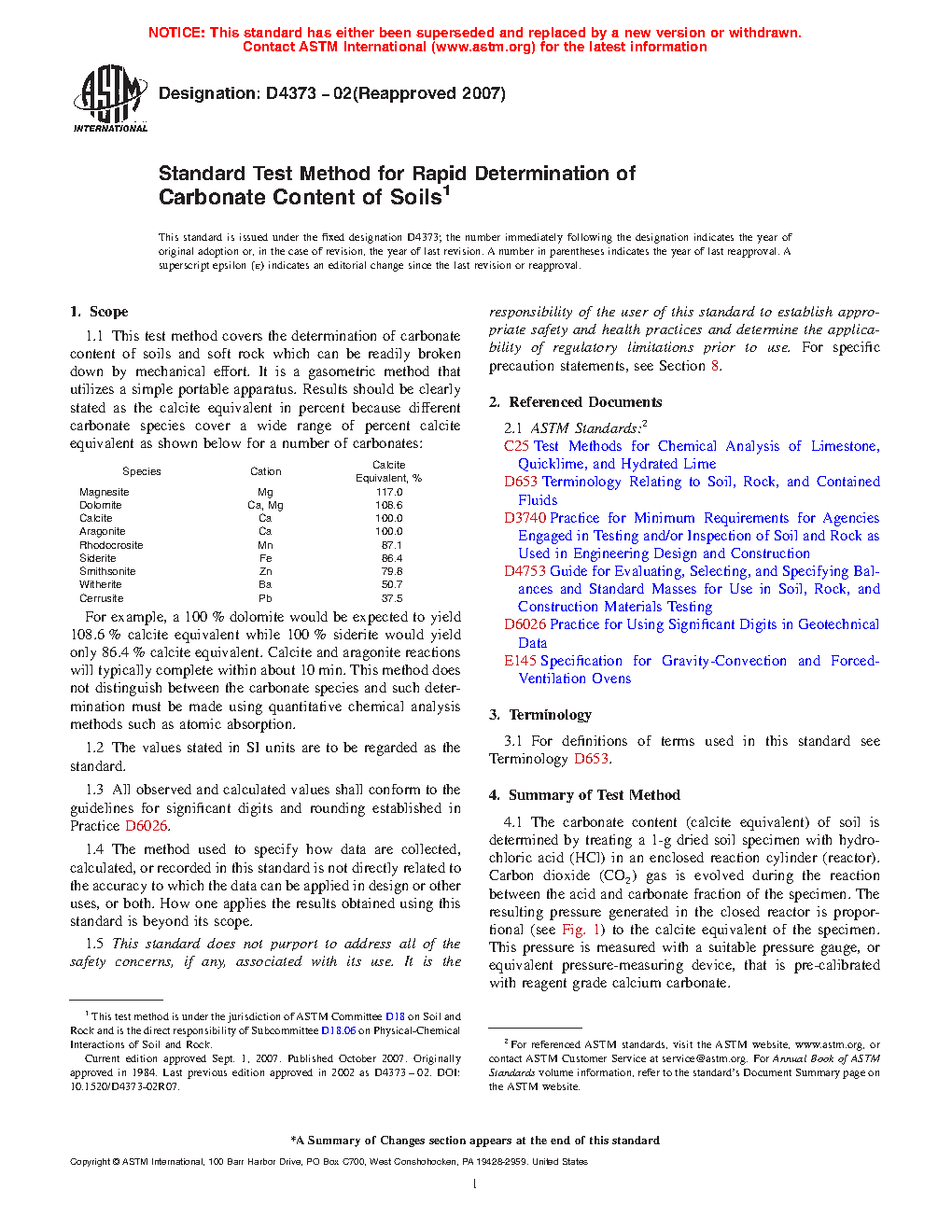 1.1 This test method covers the determination of carbonate content of soils and soft rock which can be readily broken down by mechanical effort. It is a gasometric method that uses a simple portable apparatus. Results should be clearly stated as the calcite equivalent in percent because different carbonate species cover a wide range of percent calcite equivalent as shown below for a number of carbonates: