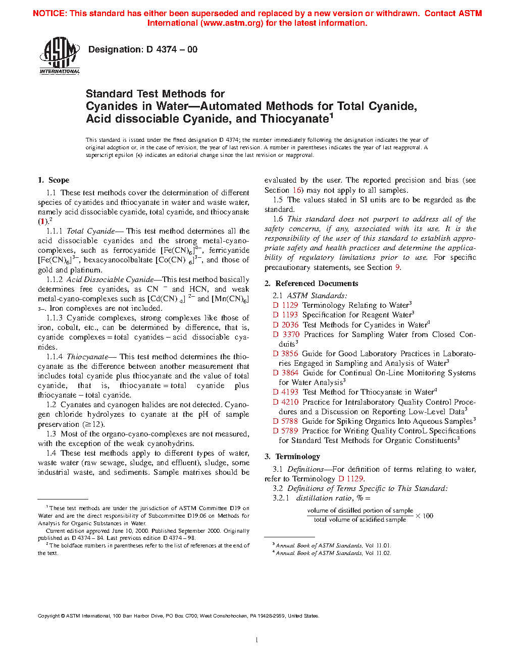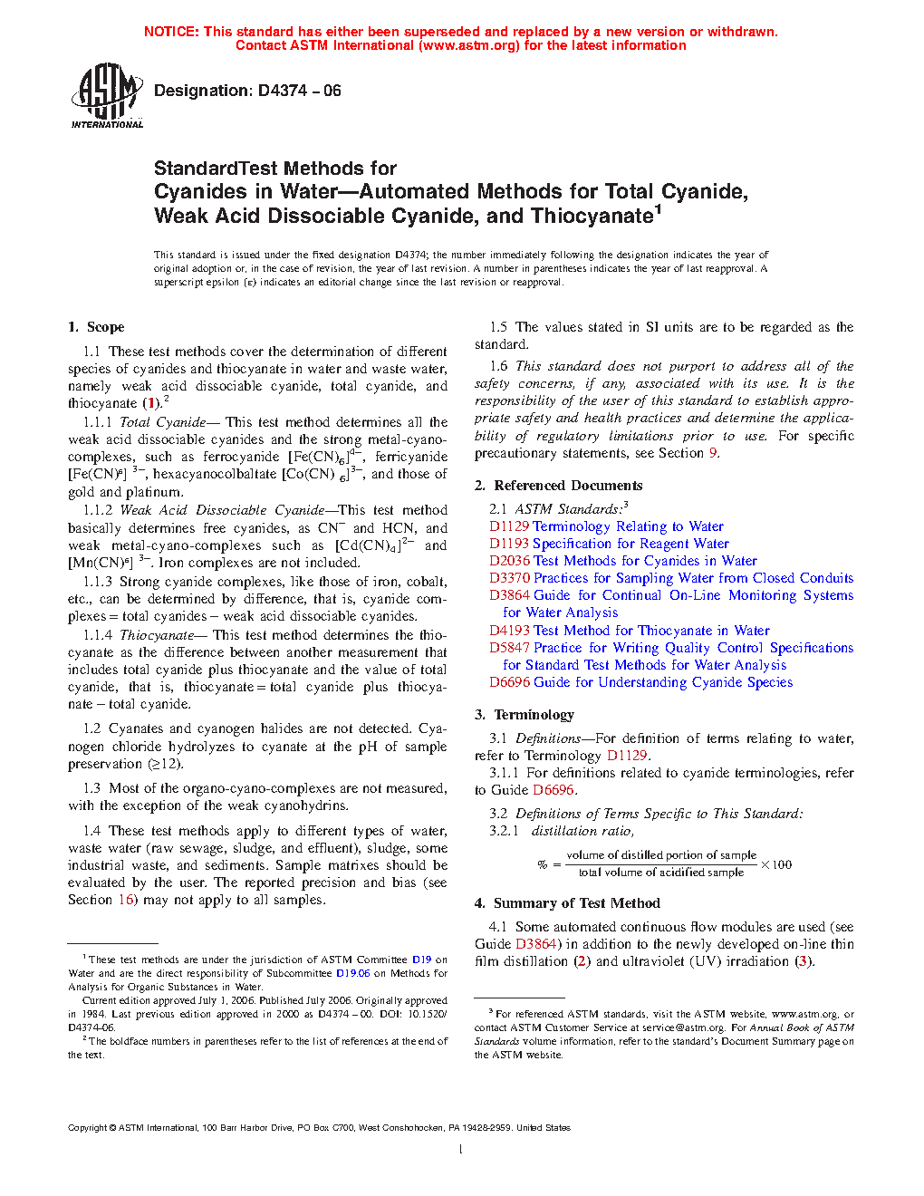 1.1 These test methods cover the determination of different species of cyanides and thiocyanate in water and waste water, namely dissociable cyanide, total cyanide, and thiocyanate (1)