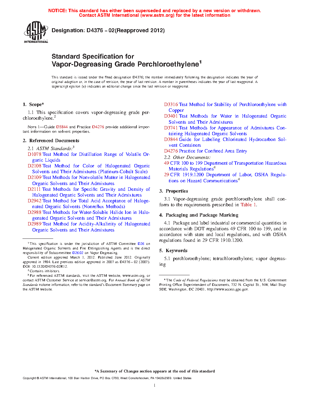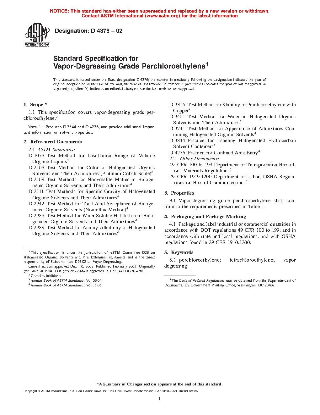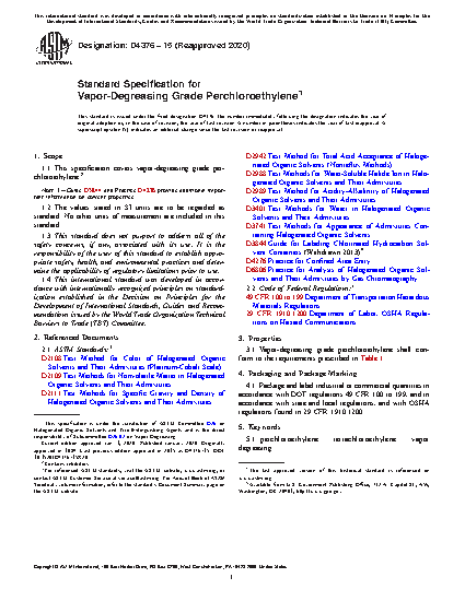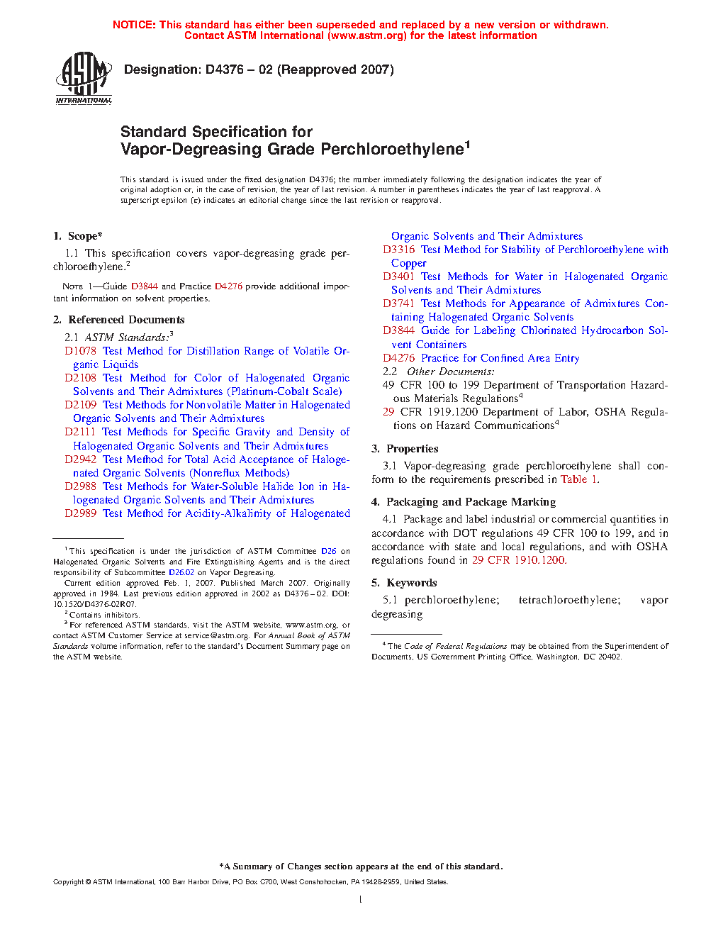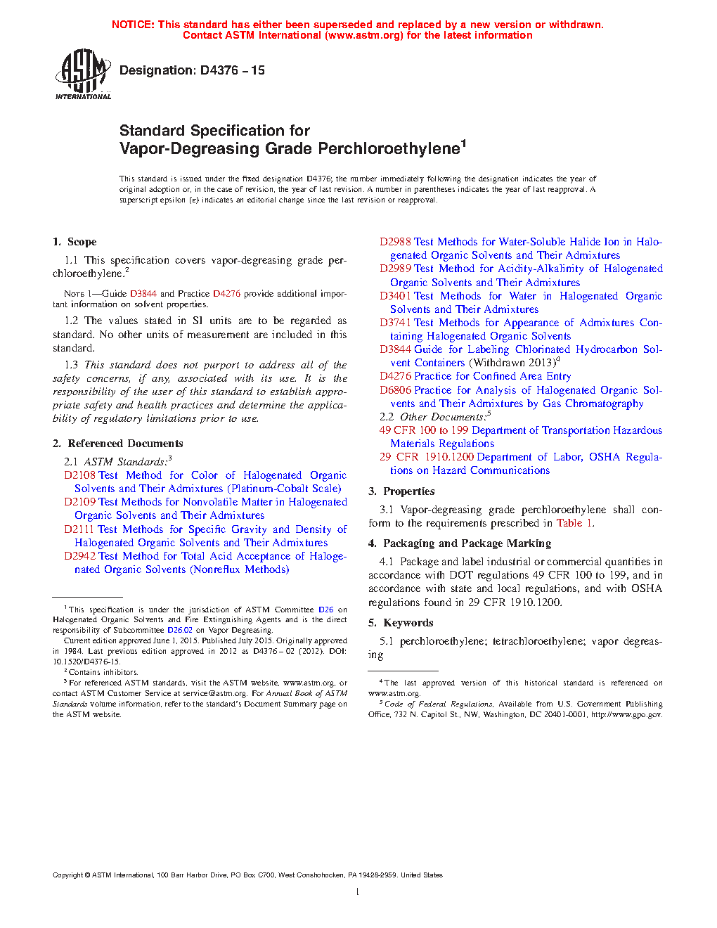This specification covers the requirements and corresponding test methods for vapor-degreasing grade perchloroethylene. When tested, materials shall conform to the following physical properties: specific gravity; distillation range (initial boiling point and dry point); acidity as HCl; alkalinity as NaOH; water content; appearance; color in Pt-co units; halides content; nonvolatile residues content; acid acceptance; and copper corrosion behavior.