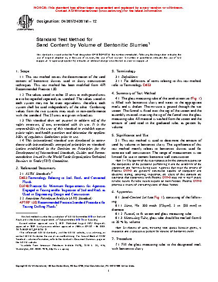 1.1 This test method covers the determination of the sand content of bentonitic slurries used in slurry construction techniques. This test method has been modified from API Recommended Practice 13B.