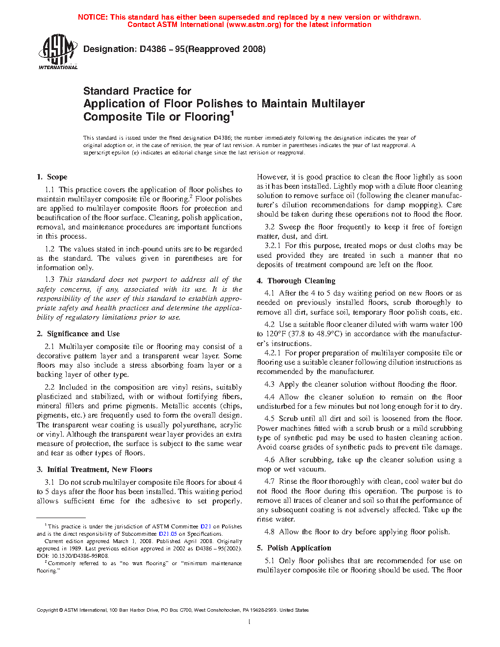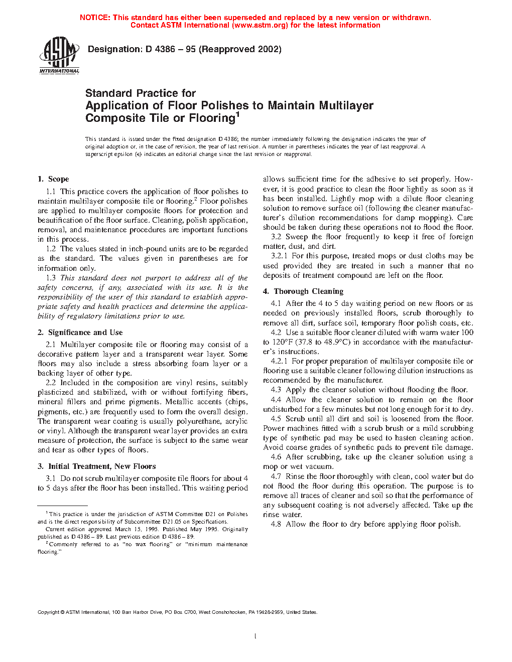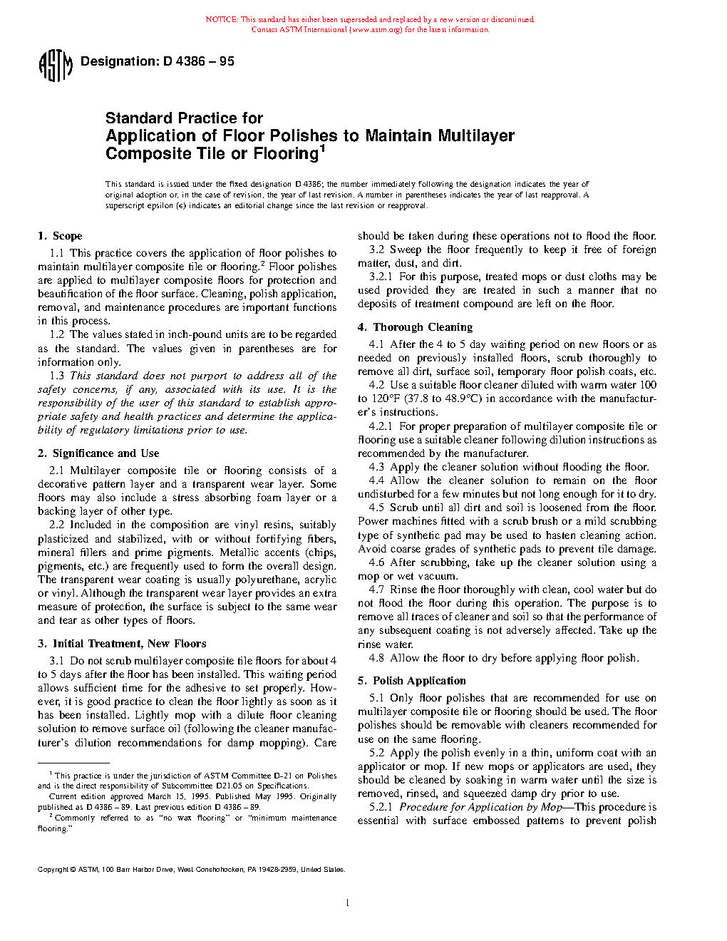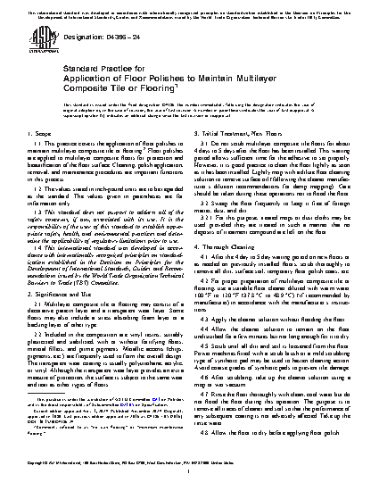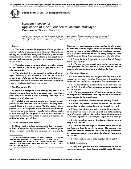 1.1 This practice covers the application of floor polishes to maintain multilayer composite tile or flooring.2 Floor polishes are applied to multilayer composite floors for protection and beautification of the floor surface. Cleaning, polish application, removal, and maintenance procedures are important functions in this process.