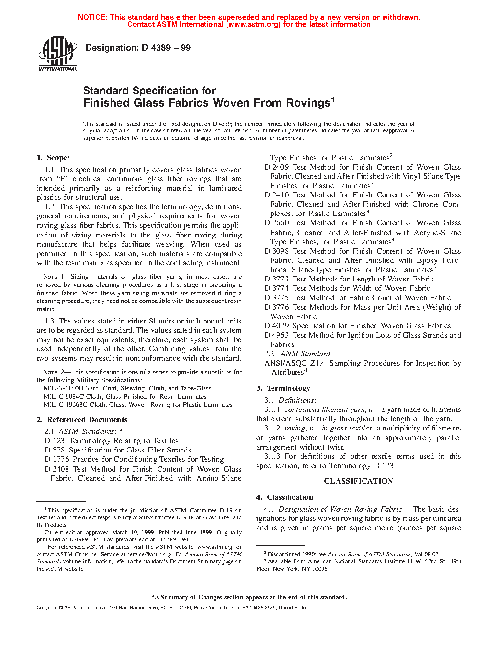 1.3 The values stated in either SI units or inch-pound units are to be regarded as standard. The values stated in each system may not be exact equivalents; therefore, each system shall be used independently of the other. Combining values from the two systems may result in nonconformance with the standard.Note 2This specification is one of a series to provide a substitute for the following Military Specifications: MIL-Y-1140H Yarn, Cord, Sleeving, Cloth, and Tape-Glass MIL-C-9084C Cloth, Glass Finished for Resin Laminates MIL-C-19663C Cloth, Glass, Woven Roving for Plastic Laminates