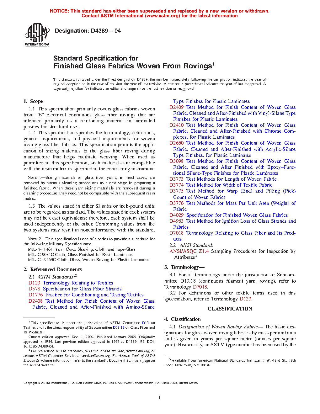 1.2 This specification specifies the terminology, definitions, general requirements, and physical requirements for woven roving glass fiber fabrics. This specification permits the application of sizing materials to the glass fiber roving during manufacture that helps facilitate weaving. When used as permitted in this specification, such materials are compatible with the resin matrix as specified in the contracting instrument.