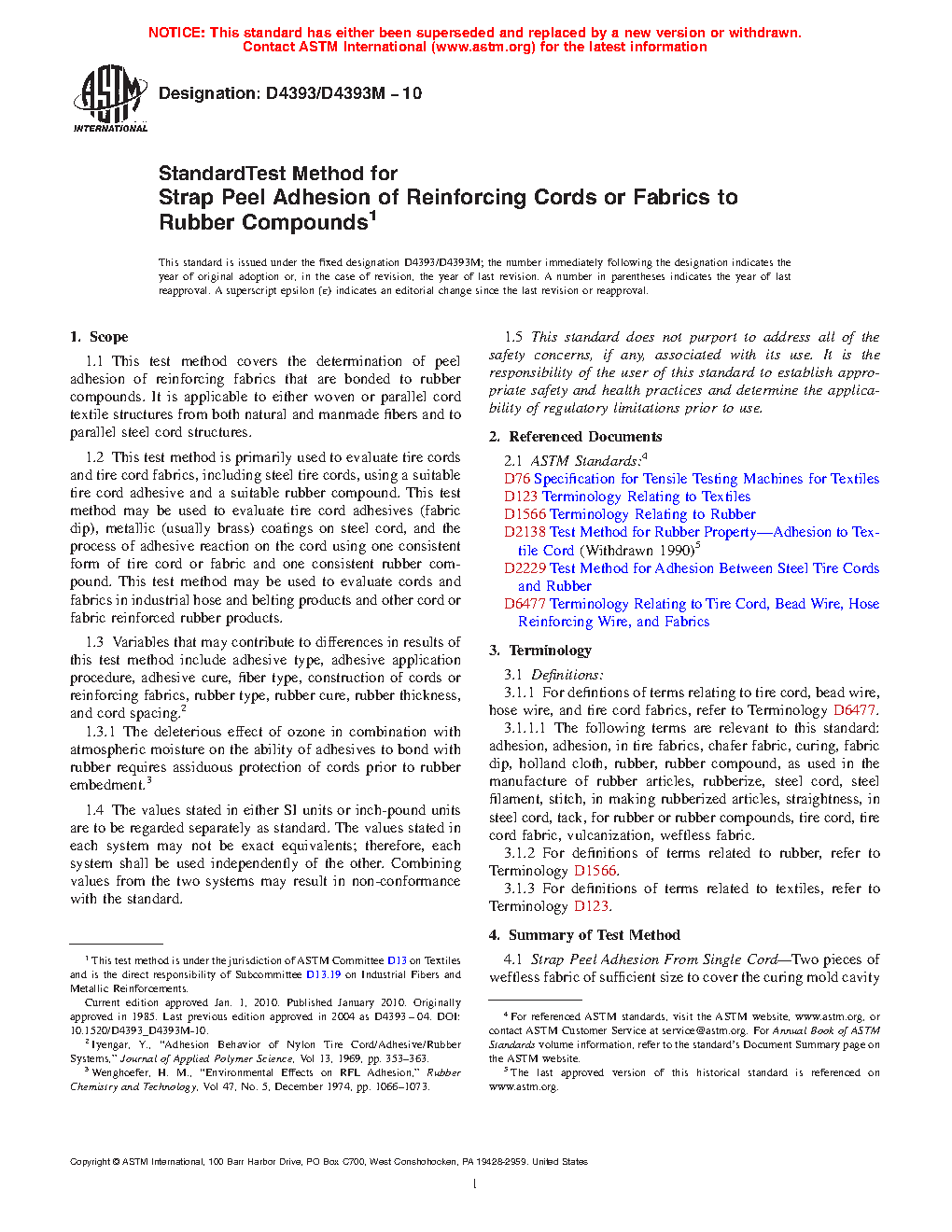 This test method is usually not preferred for acceptance testing of commercial shipments of adhesive treated cord, such as single end cord for hose. The more usual and convenient method for acceptance testing of such single cords is to prepare from a shipment a test piece or article in the same manner as the commercial article to be produced and to test cord-adhesion characteristics in this piece in a manner that compares its adhesion characteristics against a previously established, acceptable control. “H” and“ U” tests (Test Methods ) provide convenient and rapid adhesion results for acceptance testing of textile cords if needed. For steel cord, Test Method D2229 provides convenient and rapid adhesion results.