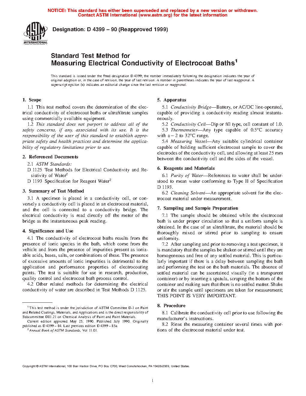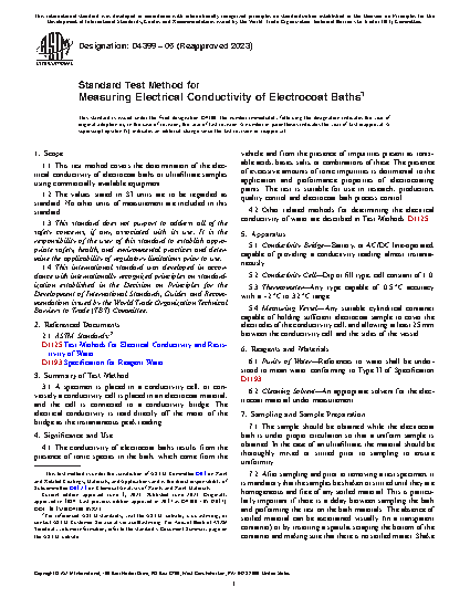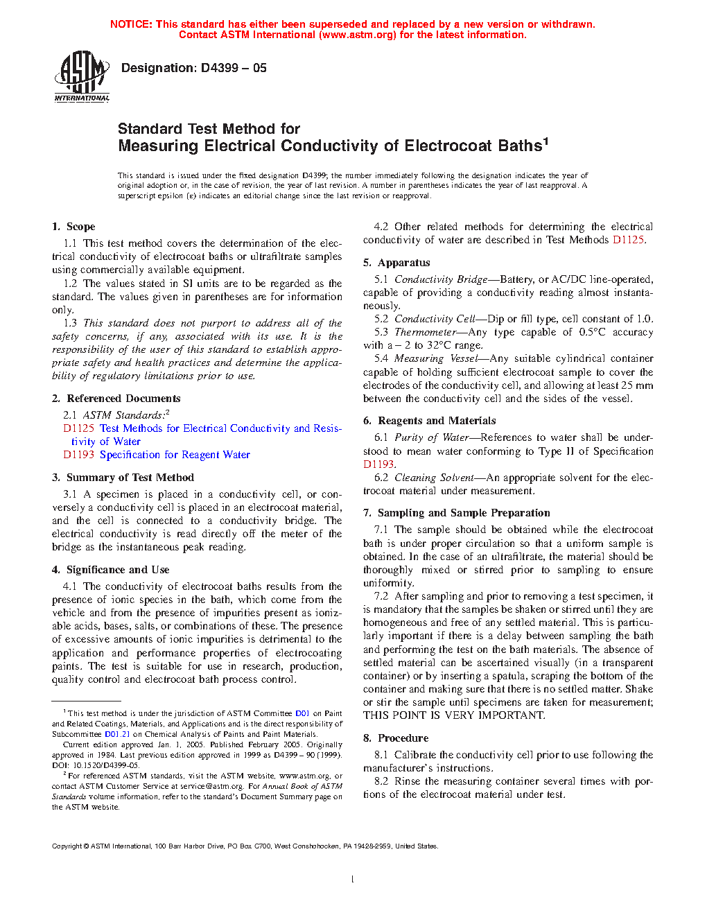 1.1 This test method covers the determination of the electrical conductivity of electrocoat baths or ultrafiltrate samples using commercially available equipment.