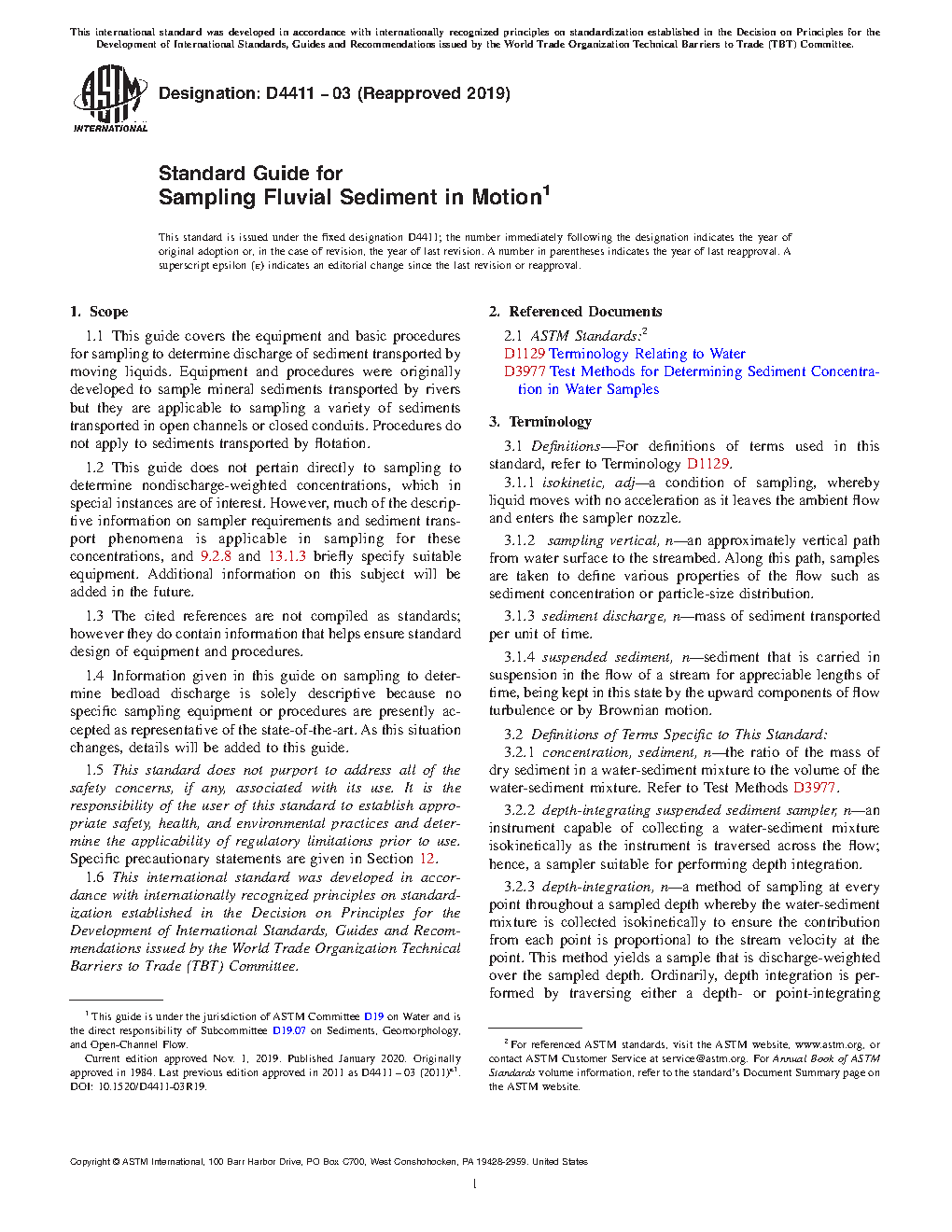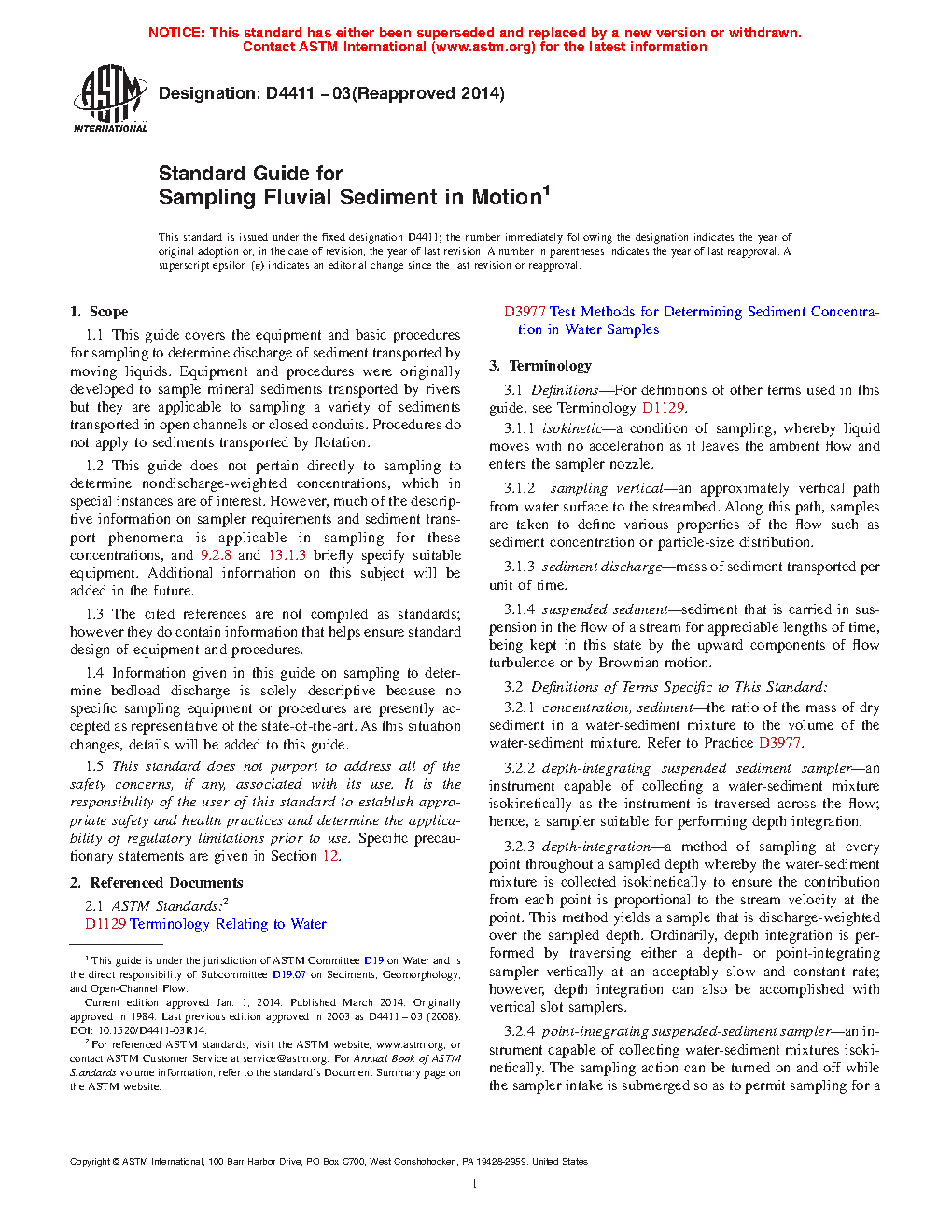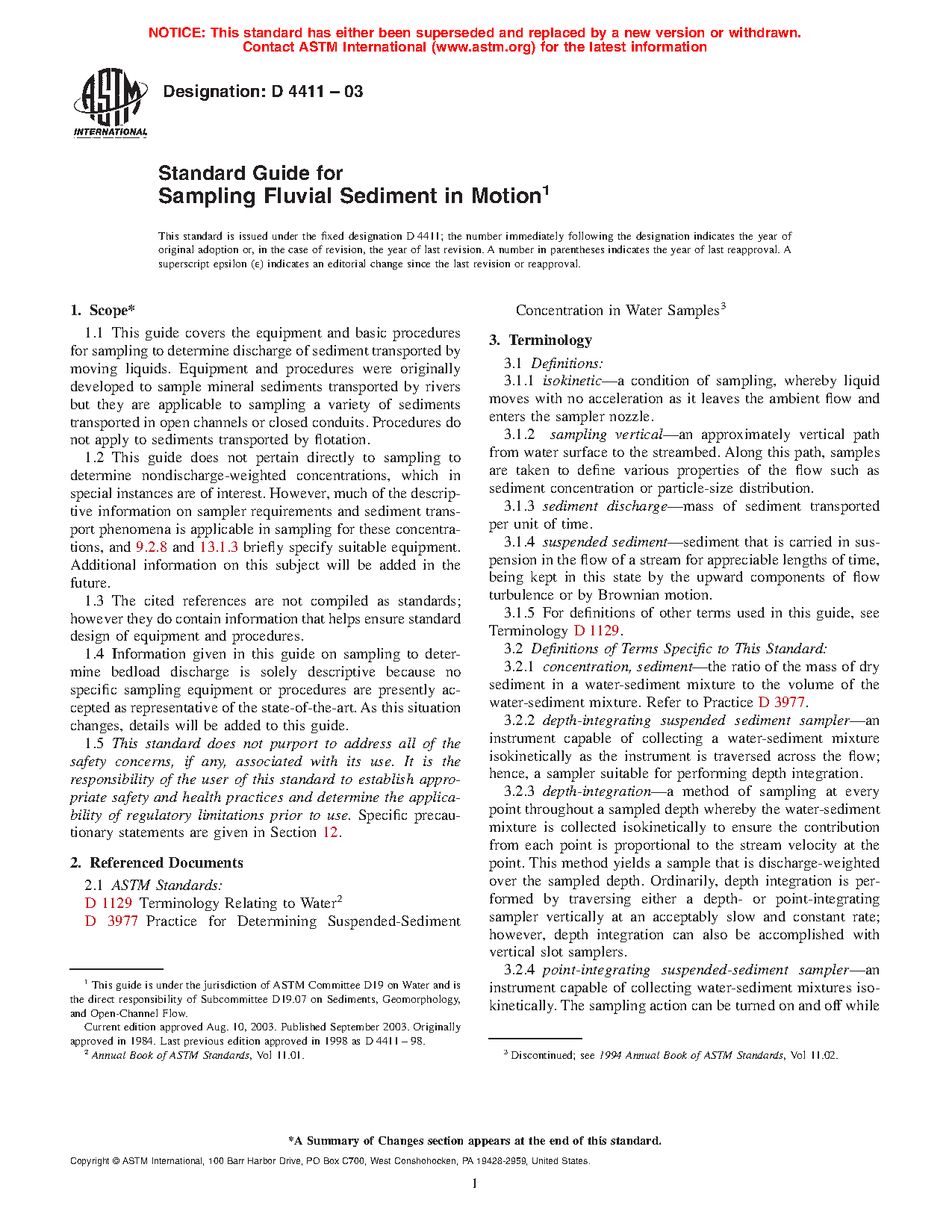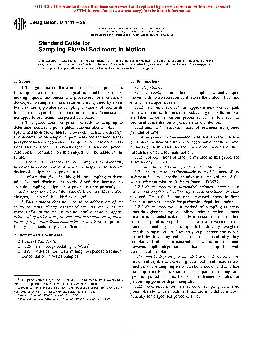 1.4 Information given in this guide on sampling to determine bedload discharge is solely descriptive because no specific sampling equipment or procedures are presently accepted as representative of the state-of-the-art. As this situation changes, details will be added to this guide.