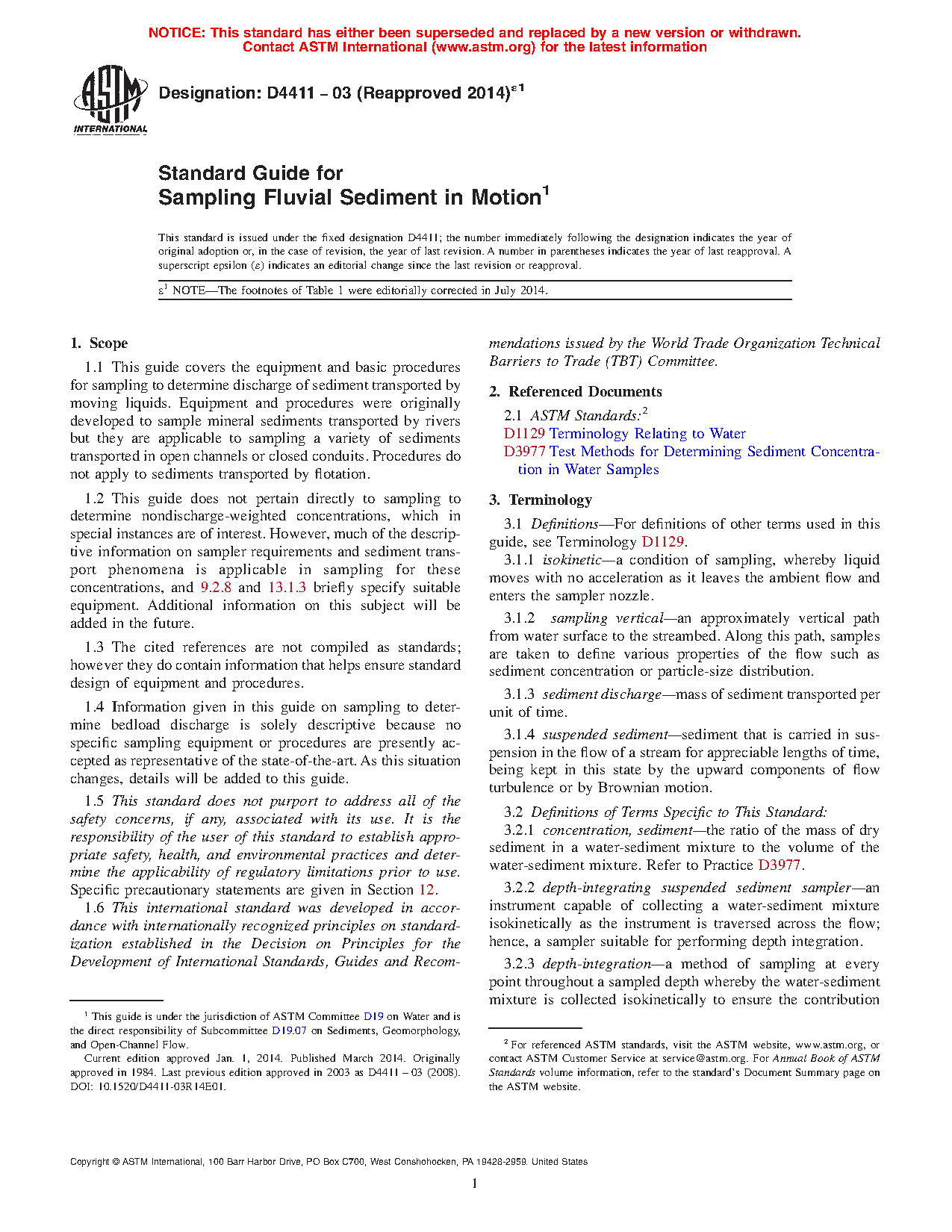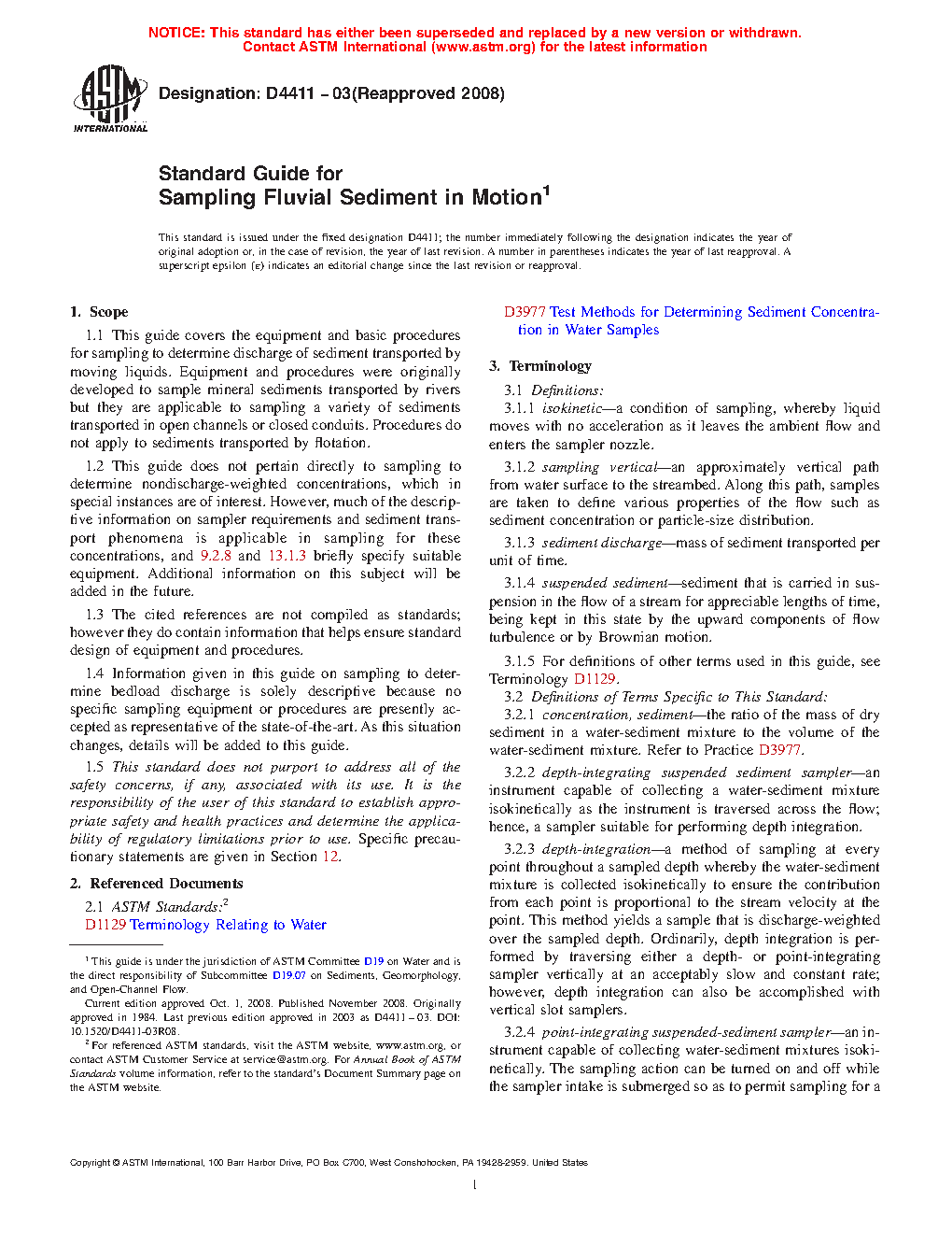 1.1 This guide covers the equipment and basic procedures for sampling to determine discharge of sediment transported by moving liquids. Equipment and procedures were originally developed to sample mineral sediments transported by rivers but they are applicable to sampling a variety of sediments transported in open channels or closed conduits. Procedures do not apply to sediments transported by flotation.