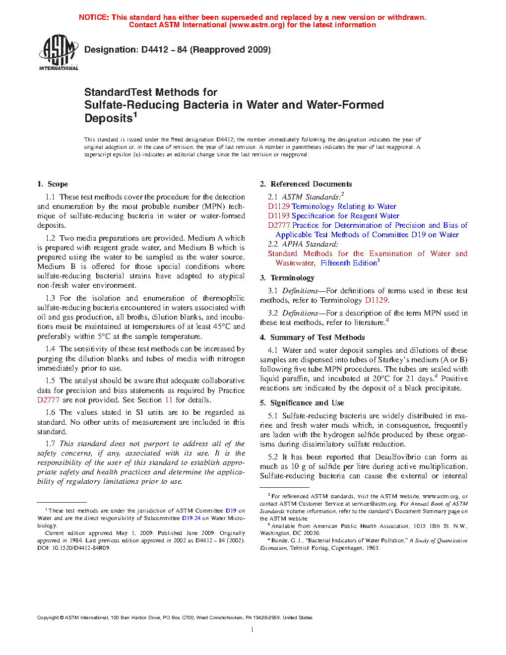 1.1 These test methods cover the procedure for the detection and enumeration by the most probable number (MPN) technique of sulfate-reducing bacteria in water or water-formed deposits.