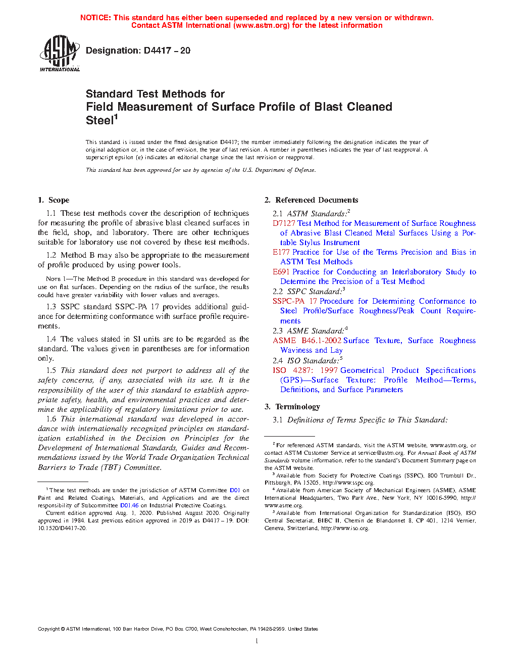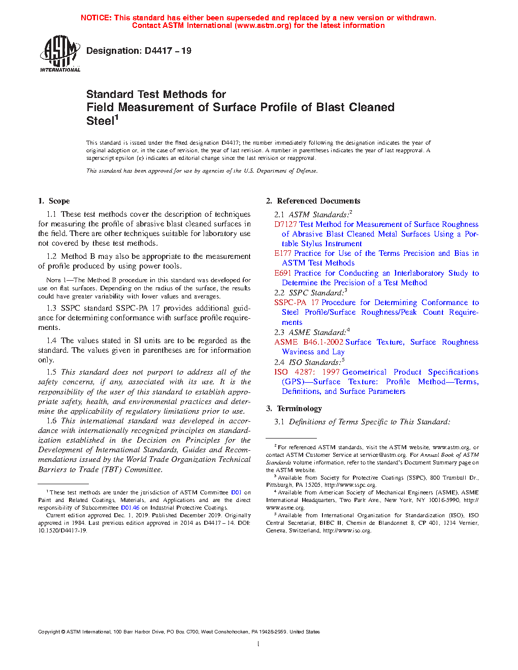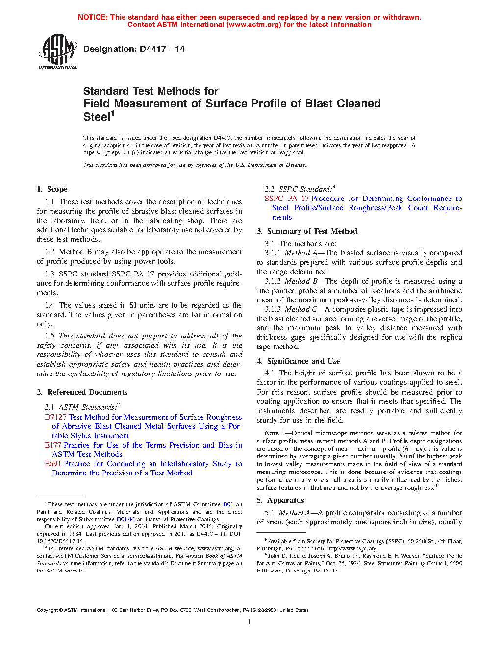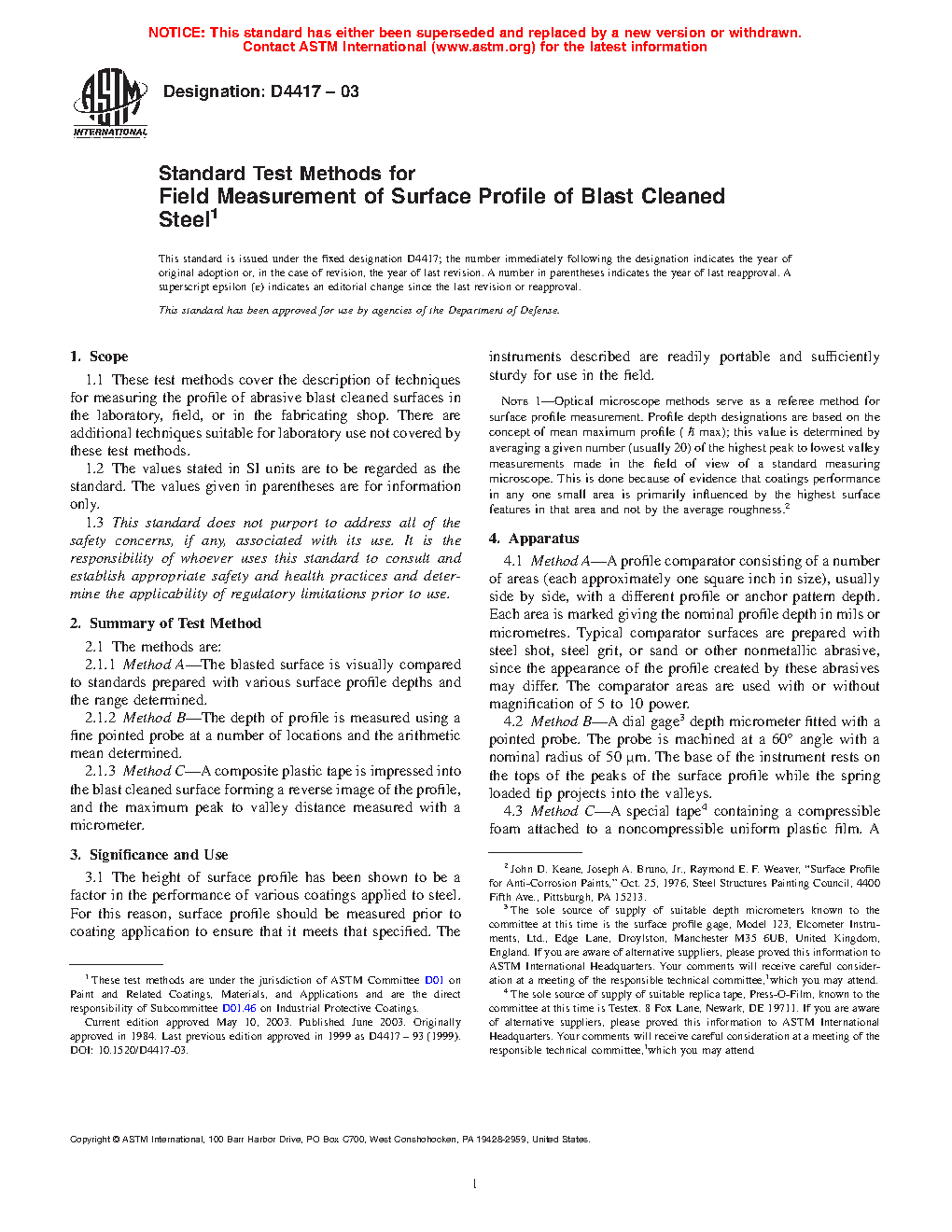 1.1 These test methods cover the description of techniques for measuring the profile of abrasive blast cleaned surfaces in the laboratory, field, or in the fabricating shop. There are additional techniques suitable for laboratory use not covered by these test methods.