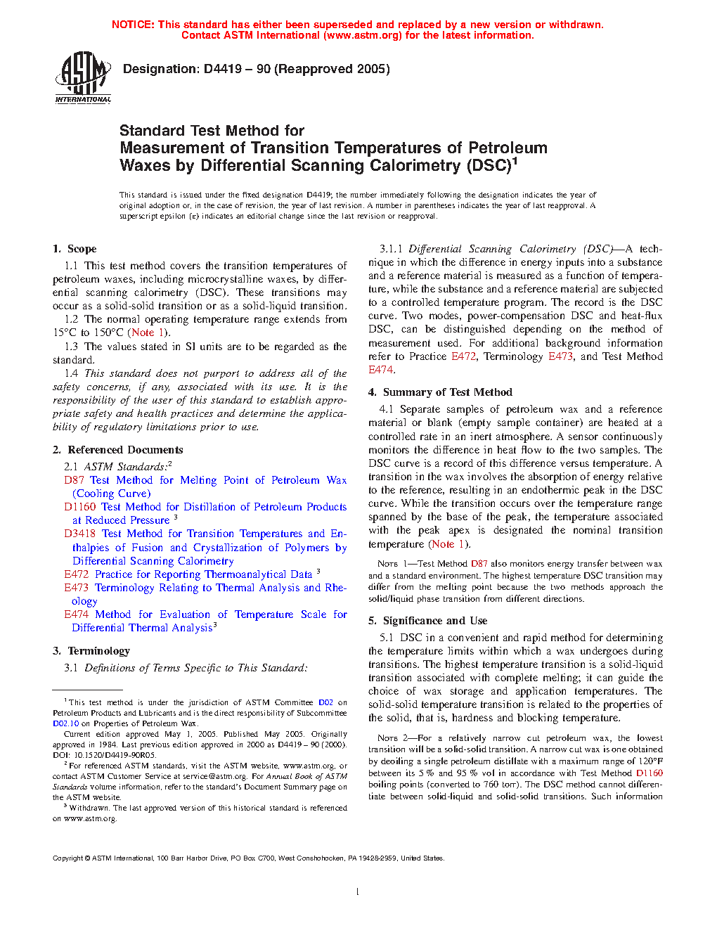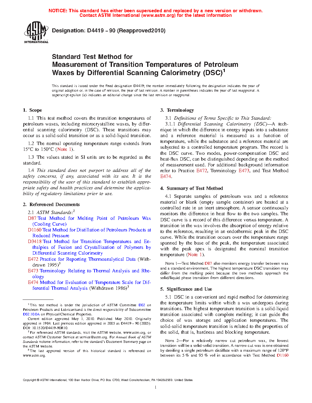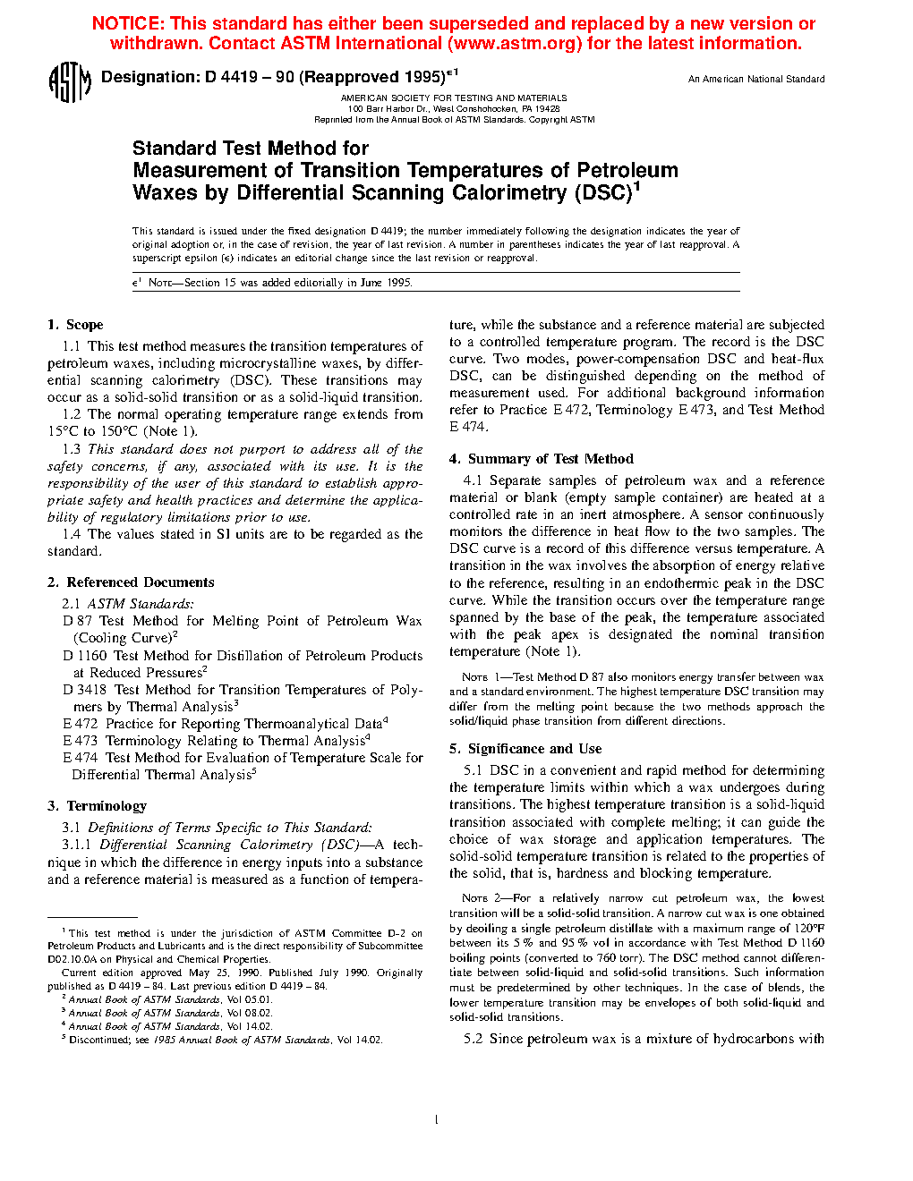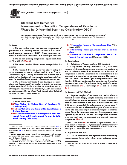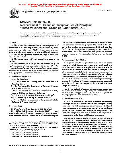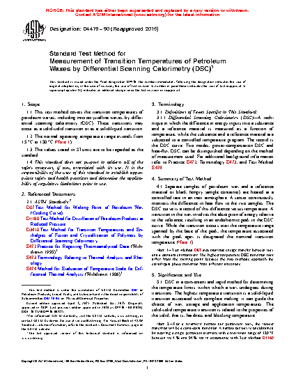 1.1 This test method covers the transition temperatures of petroleum waxes, including microcrystalline waxes, by differential scanning calorimetry (DSC). These transitions may occur as a solid-solid transition or as a solid-liquid transition.