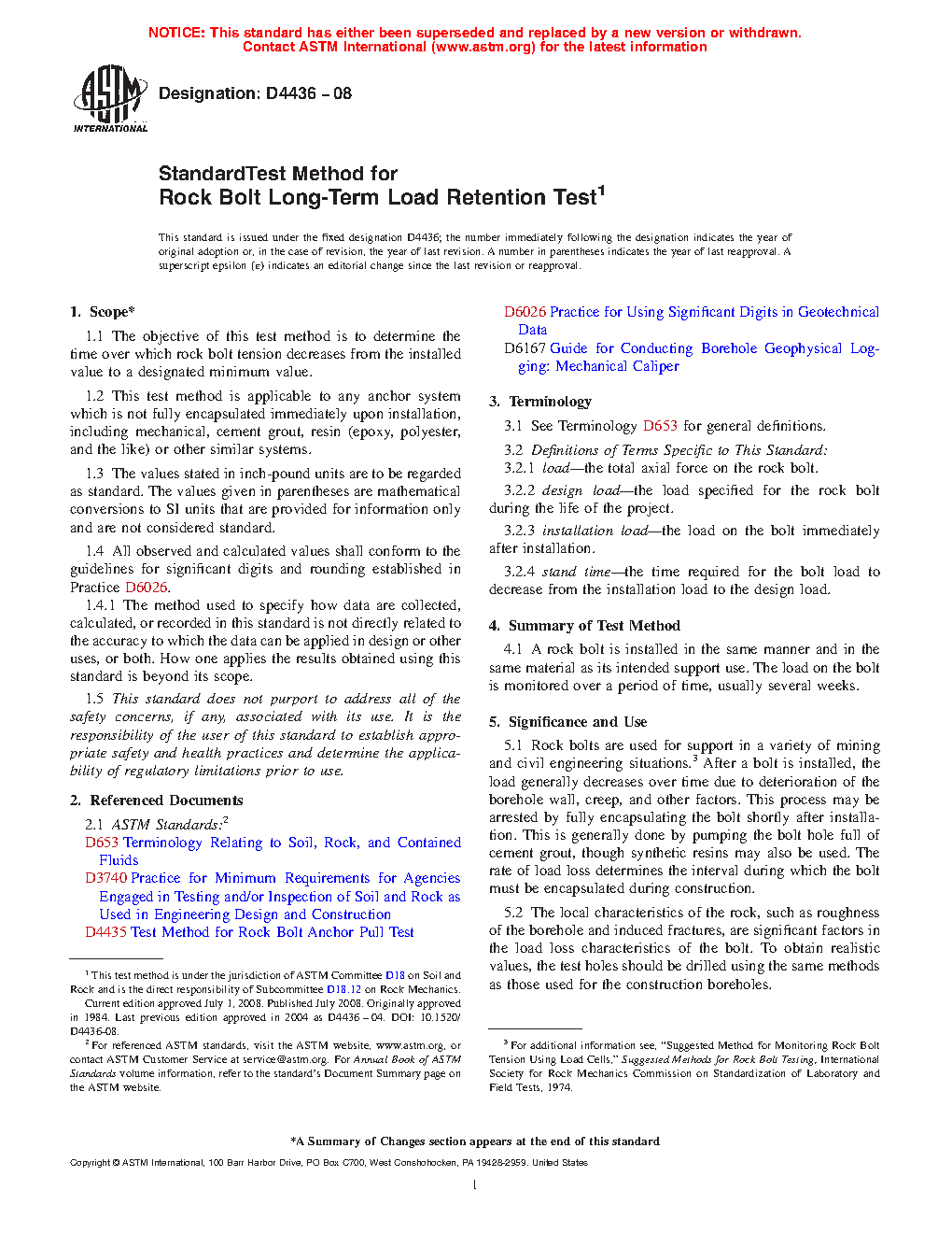 5.3.3 The design load and installation load on the rock bolt system should be predetermined. The installation load is less than the anchor capacity, as determined by Test Method D4435. The design load is less than the installation load; the amount depends on rock properties and the minimum time required to encapsulate the bolts. Alternatively, this method can be run for a predetermined time interval based on construction requirements, and a realistic design load can be determined from the data.