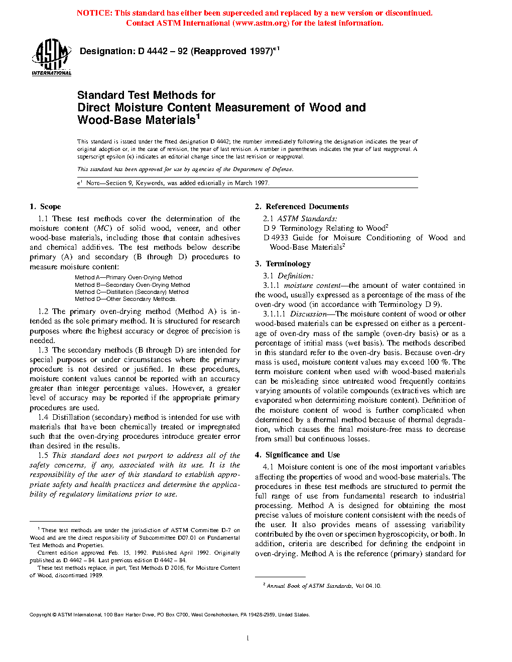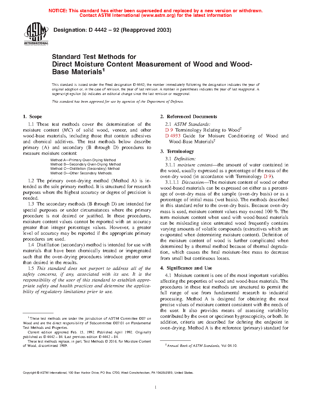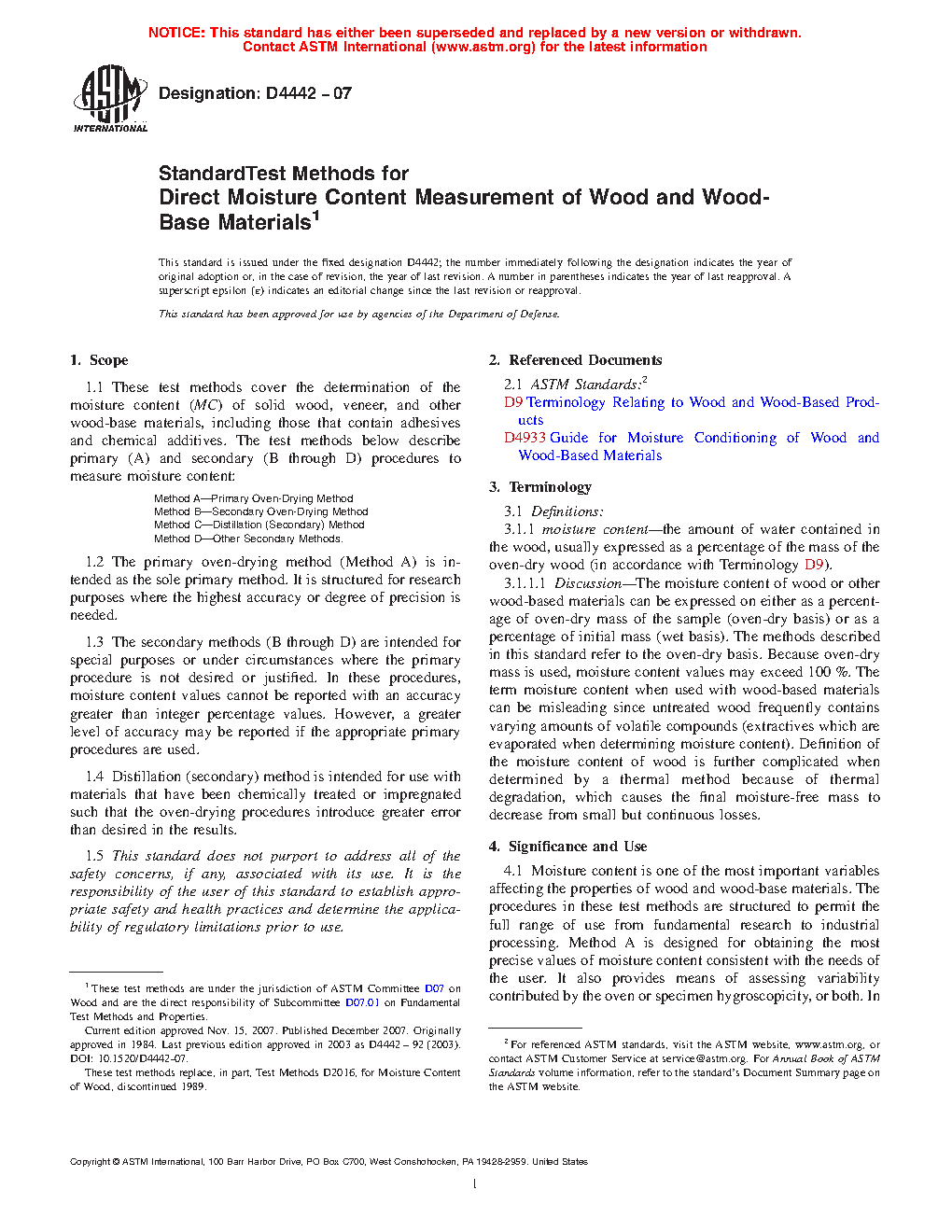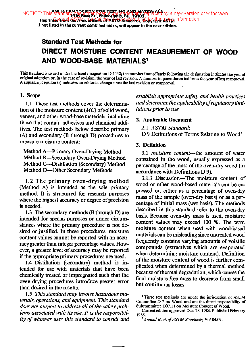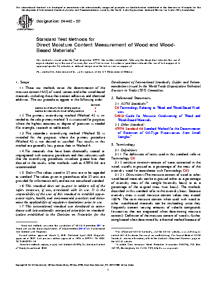 1.1 These test methods cover the determination of the moisture content (MC) of wood, veneer, and other wood-based materials, including those that contain adhesives and chemical additives. The test methods below describe primary (A) and secondary (B through D) procedures to measure moisture content: