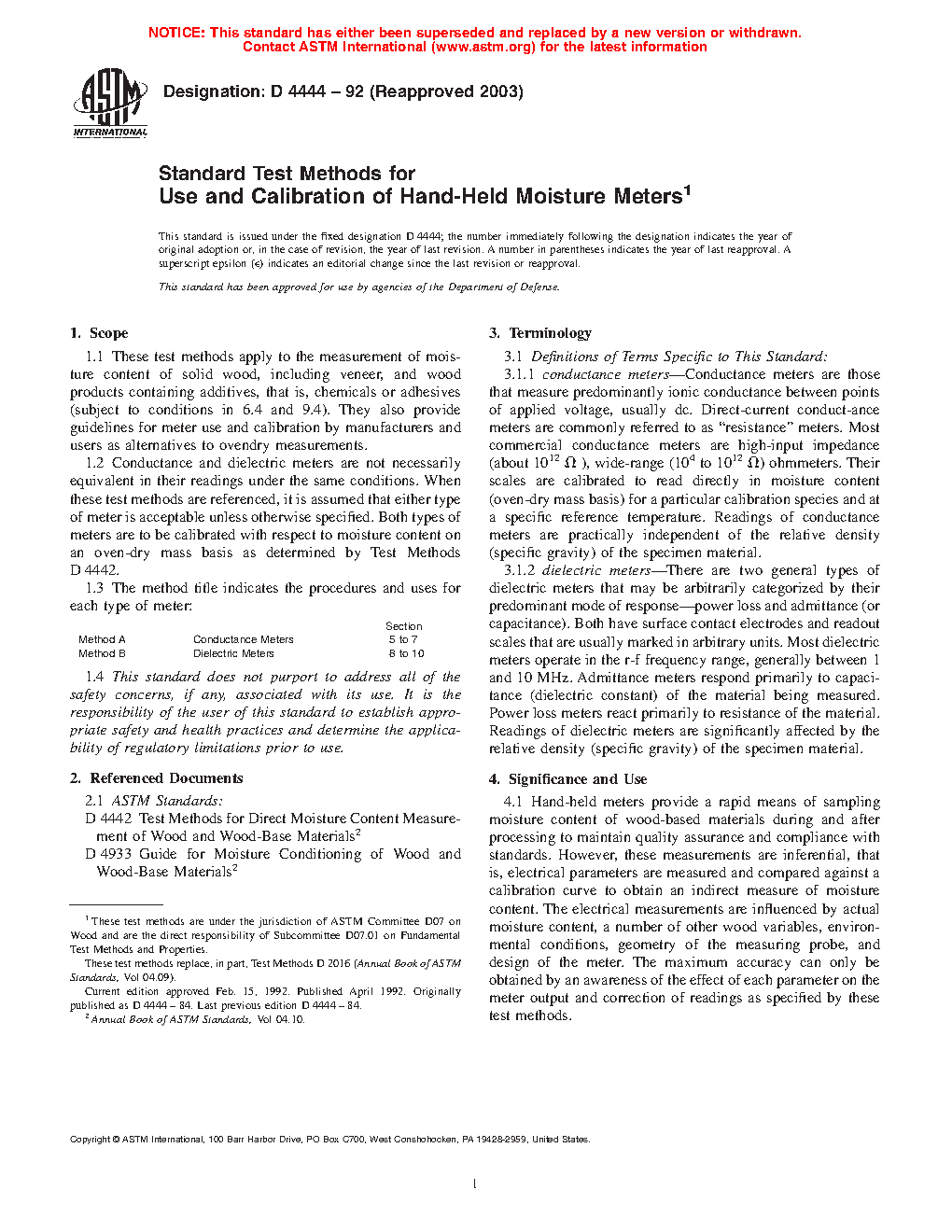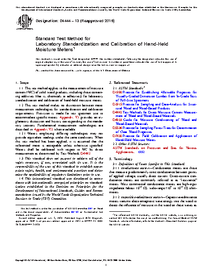 1.2 Conductance and dielectric meters are not necessarily equivalent in their readings under the same conditions. When these test methods are referenced, it is assumed that either type of meter is acceptable unless otherwise specified. Both types of meters are to be calibrated with respect to moisture content on an oven-dry mass basis as determined by Test Methods D 4442.